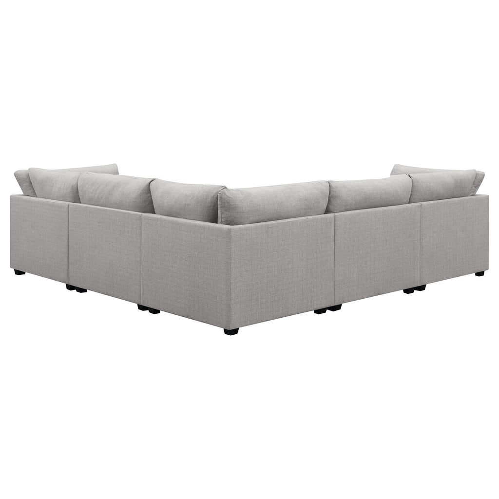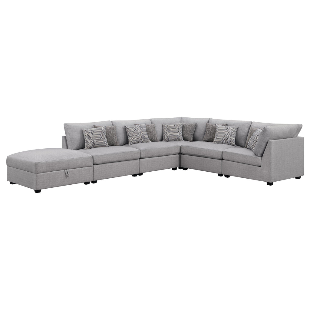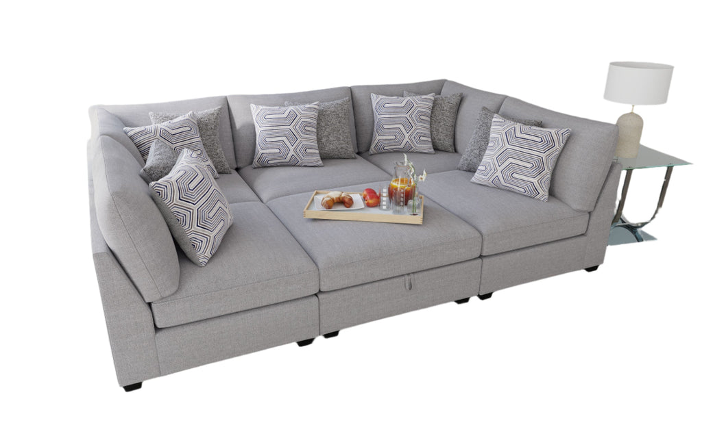 Cozy and contemporary, this modern modular sectional sofa is a stylish focal point in your inviting living room. Designed with simplicity at the forefront, it boasts smooth upholstery, straight wedge arms and plush cushions that create both a compact profile and enduring comfort. The modular set includes two corners, one armless chair and a storage ottoman, creating a chaise profile that's reversible to accommodate myriad living spaces. The ottoman top lifts to reveal interior storage that's great for everything from kid's toys to blankets. Soft gray upholstery is on-trend but neutral, and is augmented with complementary accent pillows that add softness and dimension you're going to love.