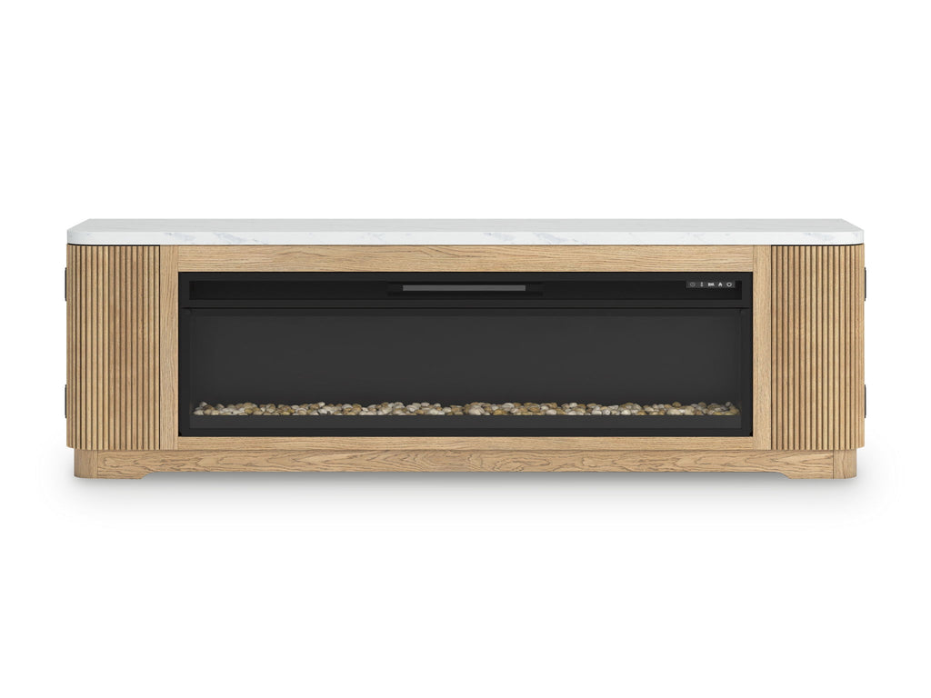 Elegance meets earthy charm in this TV stand with electric fireplace. Crafting a contemporary living room? The faux marble top expertly pairs with the reeded base for a trend-right take on day-to-day function. Open shelving and subtly integrated storage cabinets make it easy to store and display media accessories in style. For your added viewing pleasure, the wide fireplace insert gives you the cozy feel of a fireplace without the added hassle. With the touch of a button, adjust the temperature and the color-changing flames, and set the timer for long-lasting enjoyment. It comes with faux glass crystals and natural stones, so you can customize the look of the flame bed.