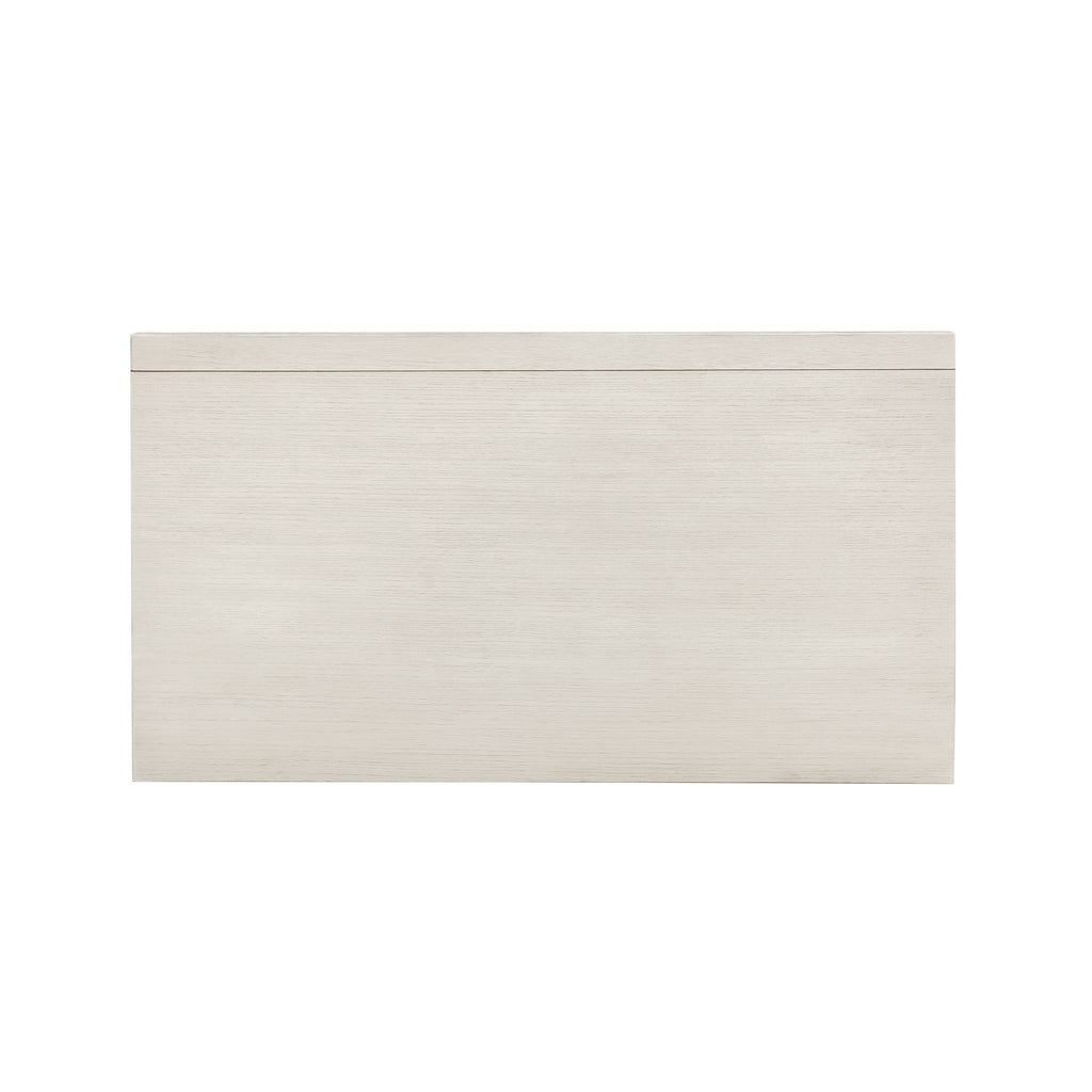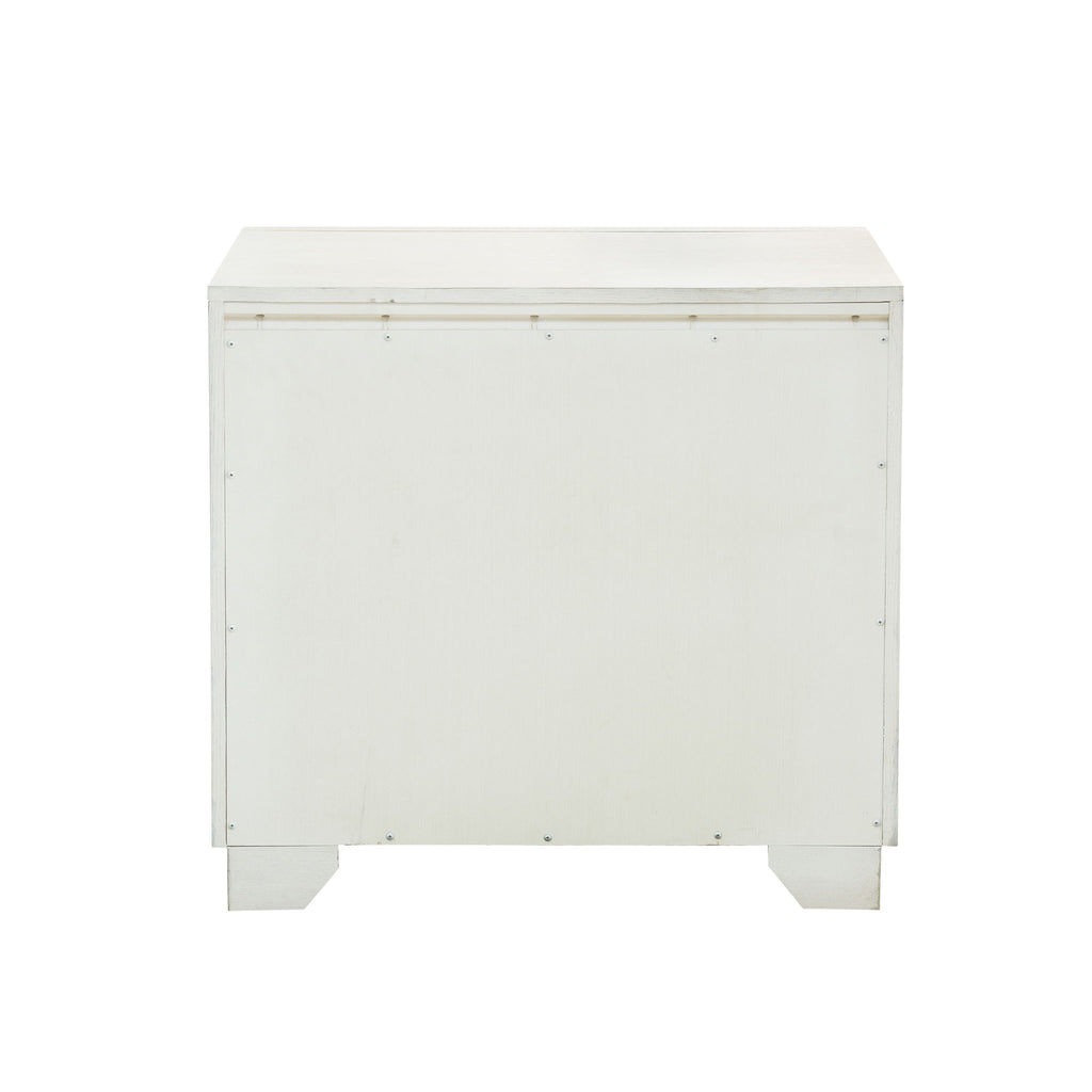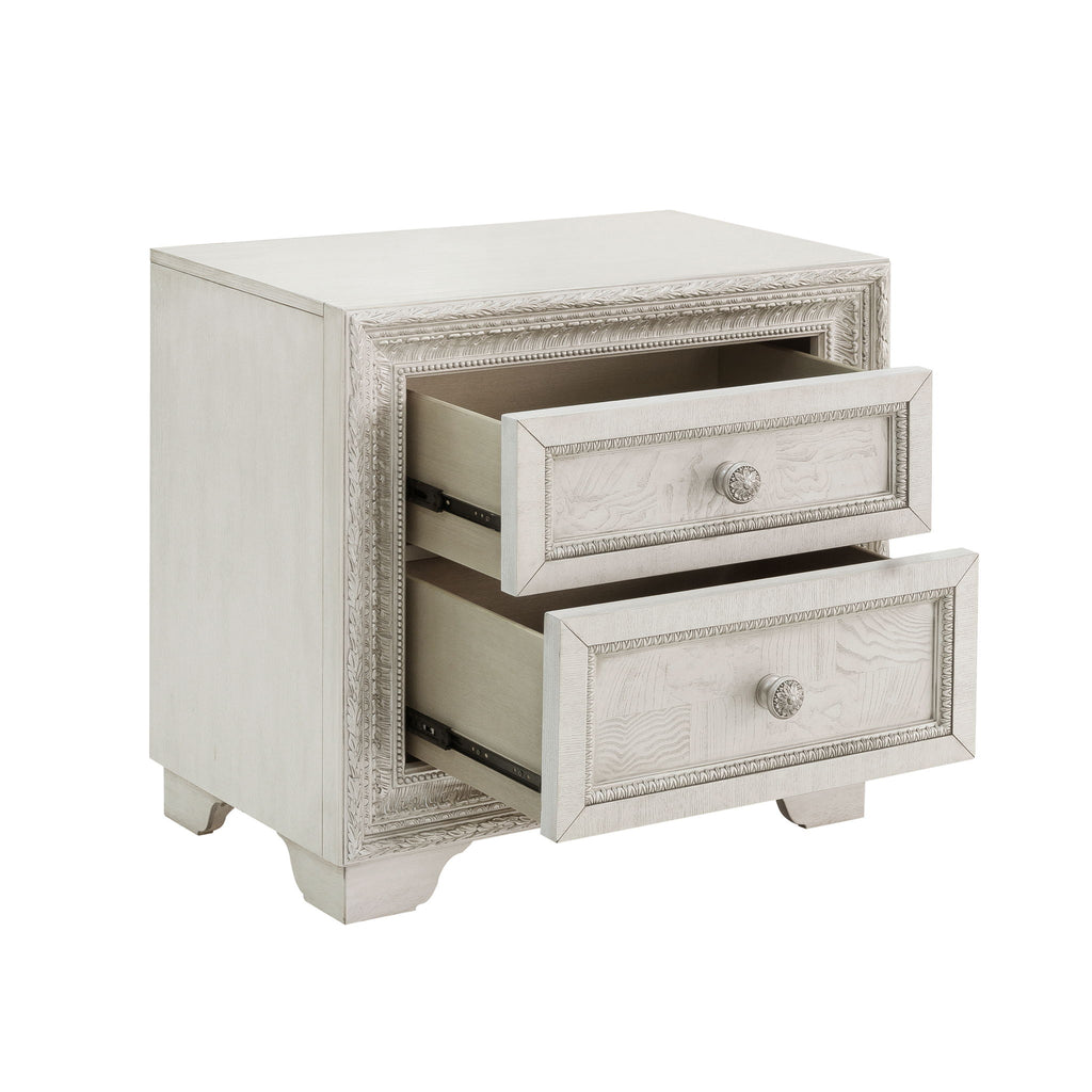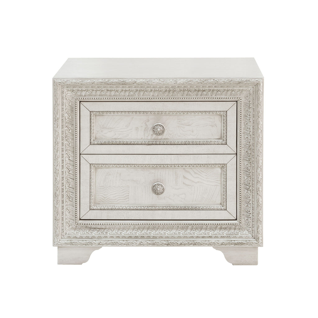 Silver tipped intricate moldings frame this lovely and functional nightstand. Crafted of decorative Swirly Ash Veneers, the semi-transparent creamy white finish accentuates the elegance of the piece. Featuring two drawers, the top drawer is felt-lined and the bottom drawer is cedar lined, with a USB charging port on the back. Rosette-shaped silver drawer pulls and bracketed feet add a finishing touch of elegance.