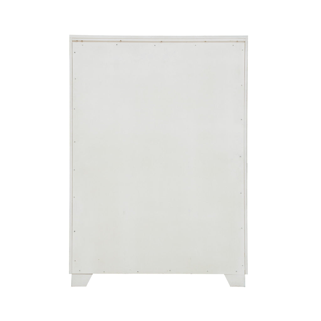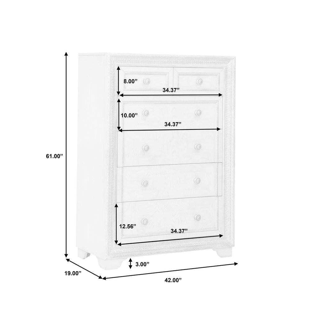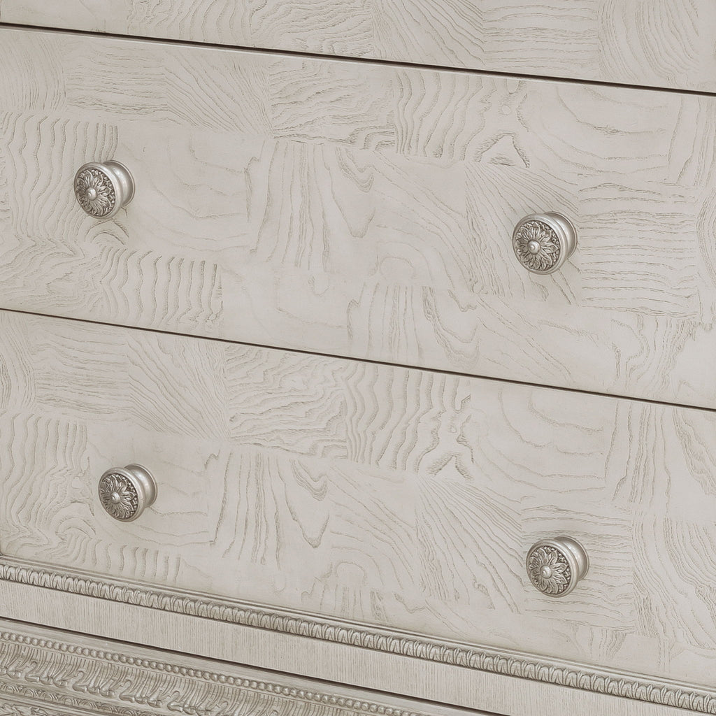 Bring elegance and functionality to your bedroom with our Camila 6-Drawer Chest. This piece displays a quiet, regal presence, featuring six drawers and silver-tipped intricate moldings for a shimmering, luxurious touch. A semi-transparent creamy white finish enhances the distinctive swirly ash veneer construction. Rosette-shaped silver drawer pulls and bracket feet complete the look, adding elegance to the overall aesthetic.
