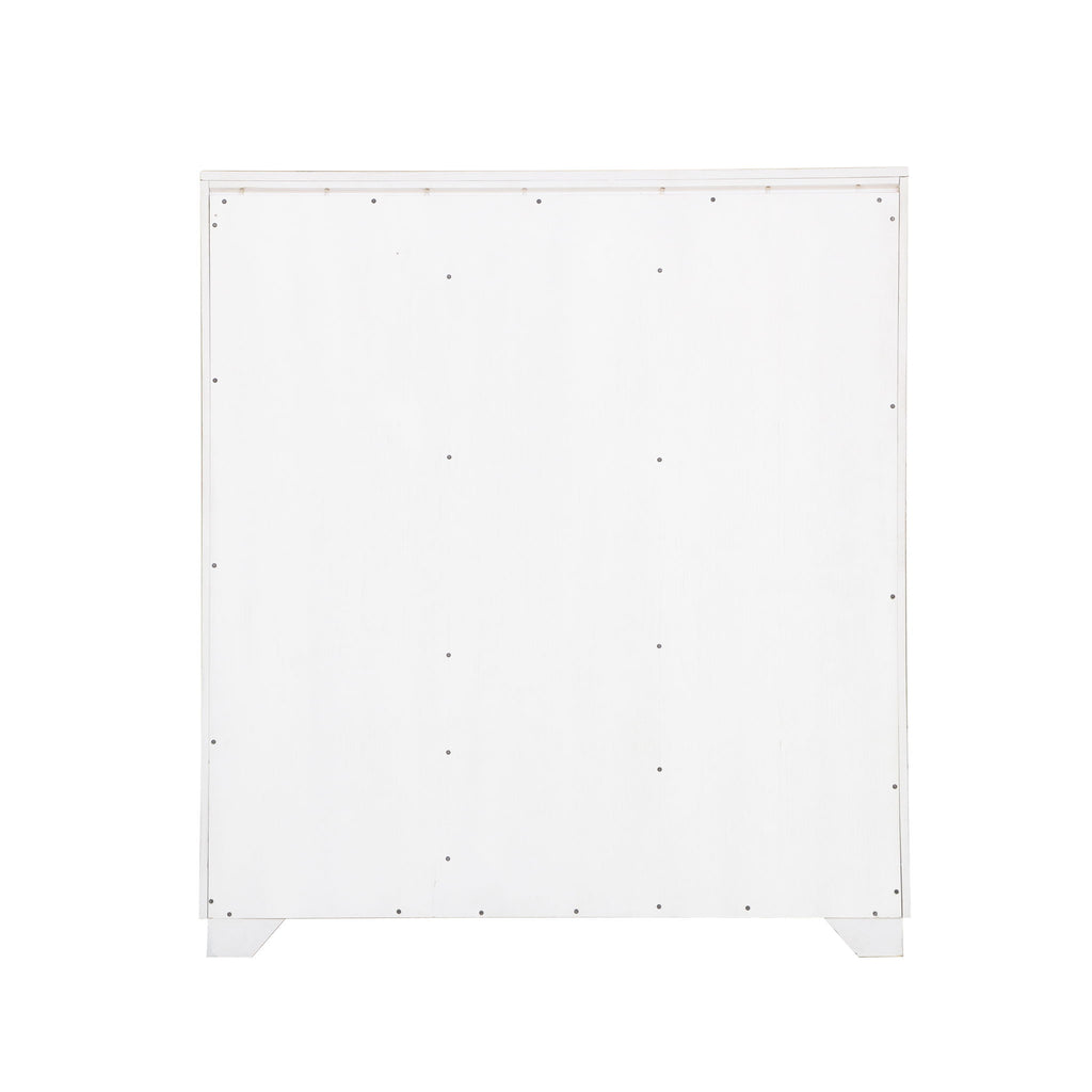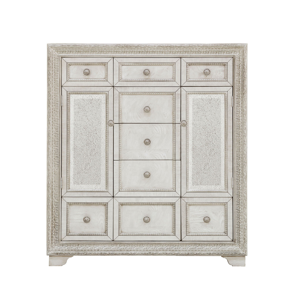 Bring elegance and functionality to your bedroom with our Camila Door Chest. This piece displays a quiet, regal presence, featuring nine drawers, two doors with antique mirror panels, and silver-tipped intricate moldings for a shimmering, luxurious touch. A semi-transparent creamy white finish enhances the distinctive swirly ash veneer construction. Behind each door are two adjustable shelves. Rosette-shaped silver drawer pulls and bracket feet complete the look, adding elegance to the overall aesthetic.