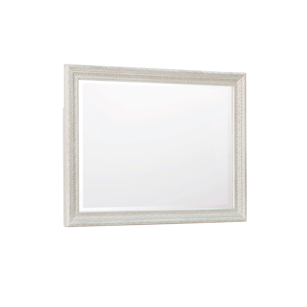 Silver-tipped intricate moldings and beaded interior molding frame the lovely Camila Mirror. A semi-transparent creamy white finish enhances the distinctive swirly ash veneer construction.