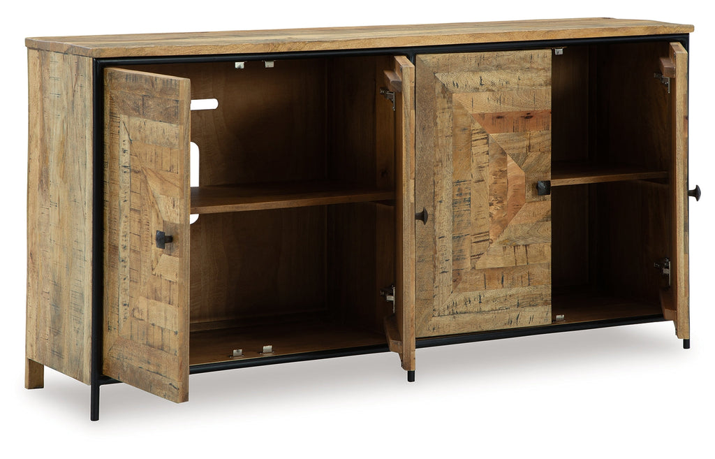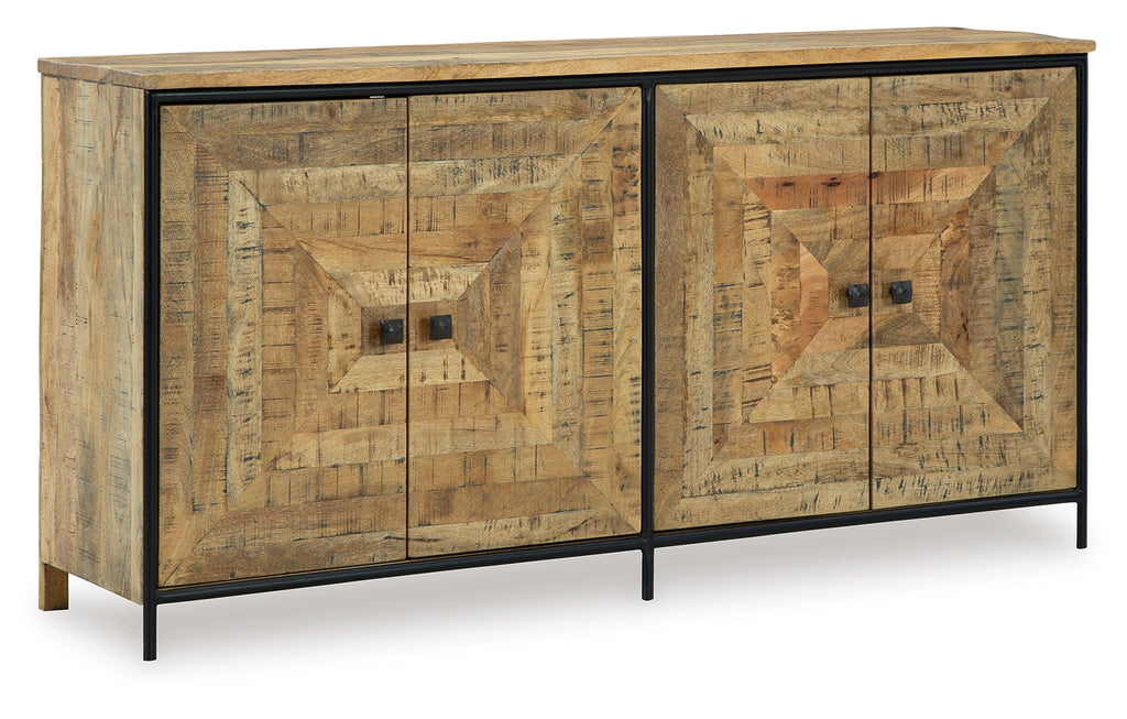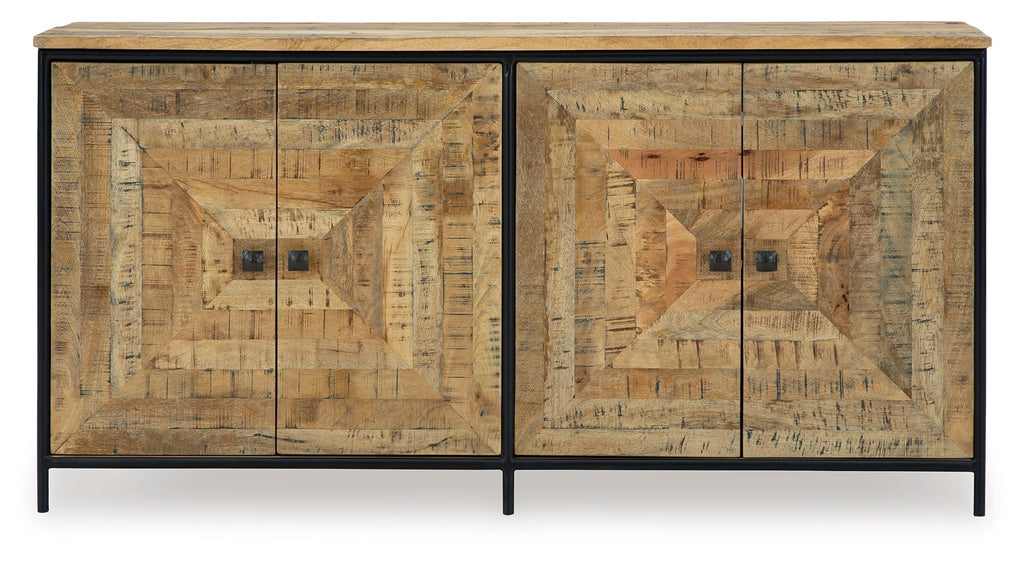 Bold in scale and rich in character, this accent cabinet makes a dramatic backdrop for entertaining. Its square patterned door fronts boast a saw mark effect, while black accents lend industrial appeal to the design. Radiating an aura of welcoming warmth, this piece fills your home with effortless elegance.