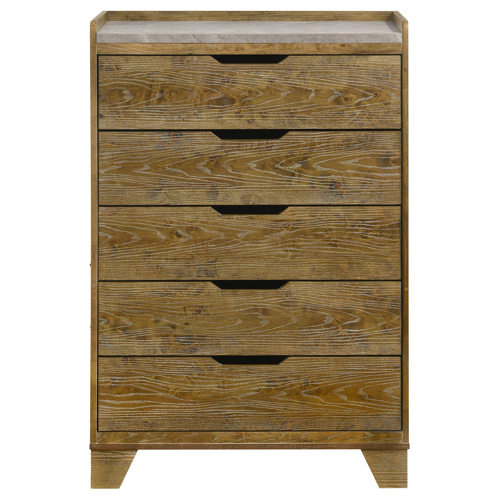 Rustic charm meets modern refinement in this five-drawer chest of drawers, where natural textures and contemporary lines come together in perfect balance. The embossed oak grain surface is finished in a warm medium oak tone that highlights the richness of the solid rubberwood construction. A faux marble melamine top adds a touch of elegance, while the sculpted finger pulls and heavy-duty glides ensure smooth, quiet function with every use.