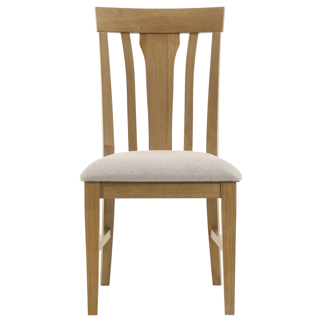 A fresh take on familiar tradition, this dining side chair pairs soft contours with classic craftsmanship. The sculpted slat back design adds character and support, while the padded eggshell white seat cushion provides lasting comfort. Framed in solid rubberwood with engineered wood accents and a light brown finish, this chair offers a relaxed yet polished look that fits effortlessly into casual or transitional dining spaces.