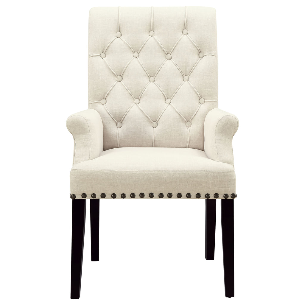 Designed for both luxury and support, this arm chair brings an elegant presence to any dining space. Its button-tufted high back and rolled top lend a timeless aesthetic, while the addition of padded armrests enhances comfort. Hand-applied nailhead trim offers a sophisticated finishing touch, complementing the chairÕs tailored silhouette. A generously padded seat and sturdy legs ensure both durability and long-lasting comfort, making it a stunning choice for formal and everyday dining alike.