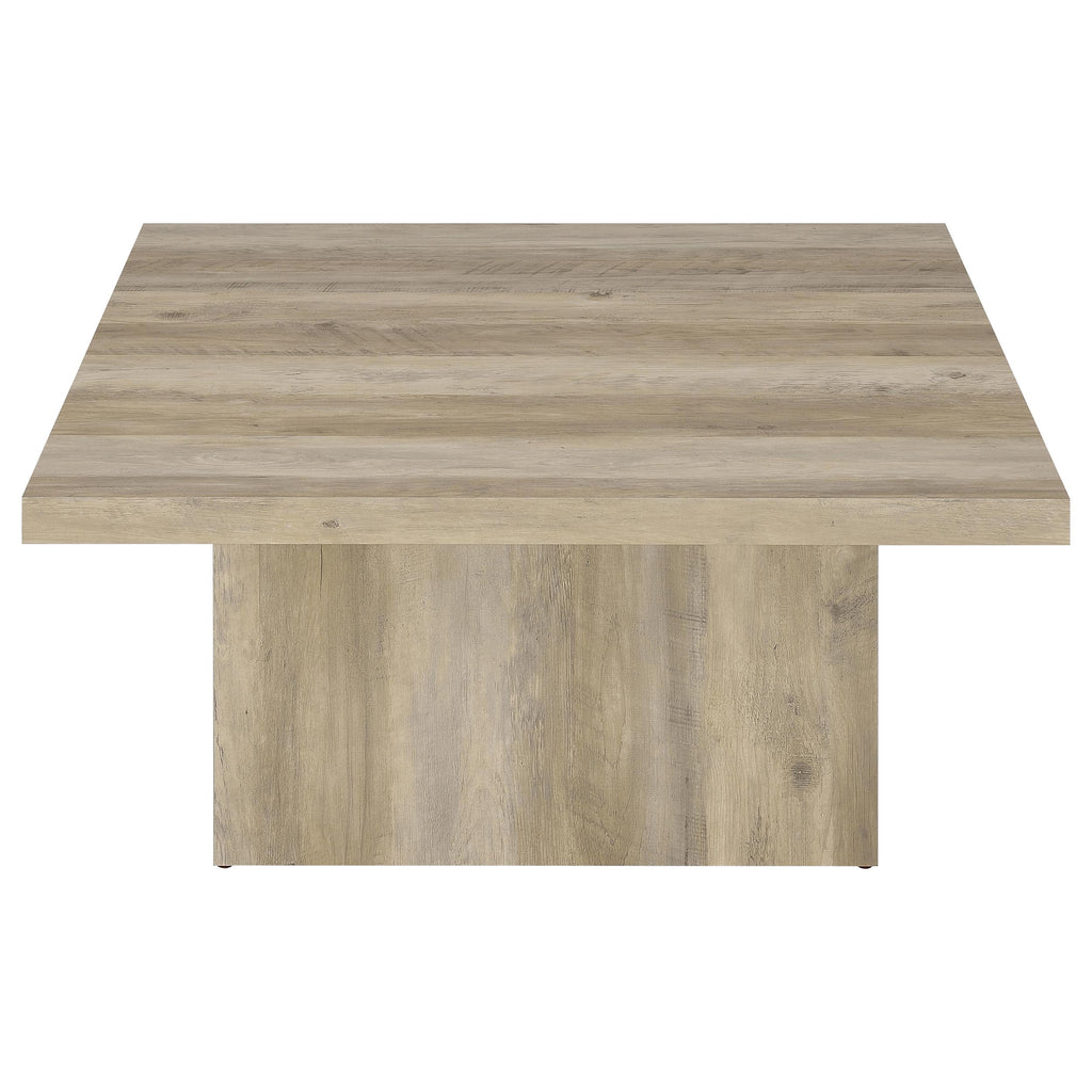 Bold and beautifully grounded, this coffee table blends rustic texture with architectural simplicity. A thick square top rests on a broad plinth base, forming a clean, sculptural profile. The distressed pine finish reveals warm grain variation that adds organic depth. Crafted from engineered wood with a melamine veneer, this cocktail table brings earthy charm and visual weight to any living room or open lounge space.