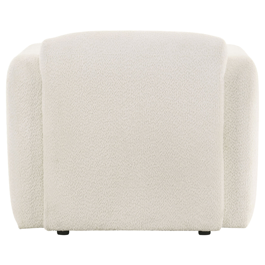 This modern accent chair brings sculptural softness and deep comfort to any living space. Wrapped in a richly textured fabric, its rounded frame flows from low-profile back to wide track arms with effortless ease. Plush foam cushioning and pocket coil seating deliver the ideal blend of sink-in softness and lasting support. With its minimal silhouette and gentle curves, this chair adds a cozy yet elevated presence to any room.
