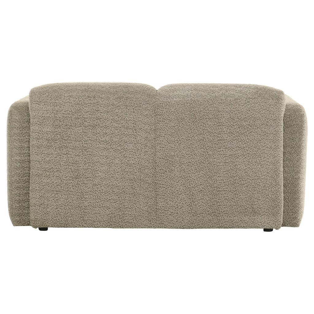 This sculpted loveseat brings bold softness and inviting texture to modern spaces. Its low-profile frame is wrapped in richly textured fabric with a cozy, tactile feel. Rounded track arms and a smooth, contoured silhouette create a cocoon of comfort. High-quality foam and pocket coil seating ensure long-lasting support without sacrificing softness. With a clean, minimal form, this two-seat loveseat adds warmth and refined presence to any living room or lounge.