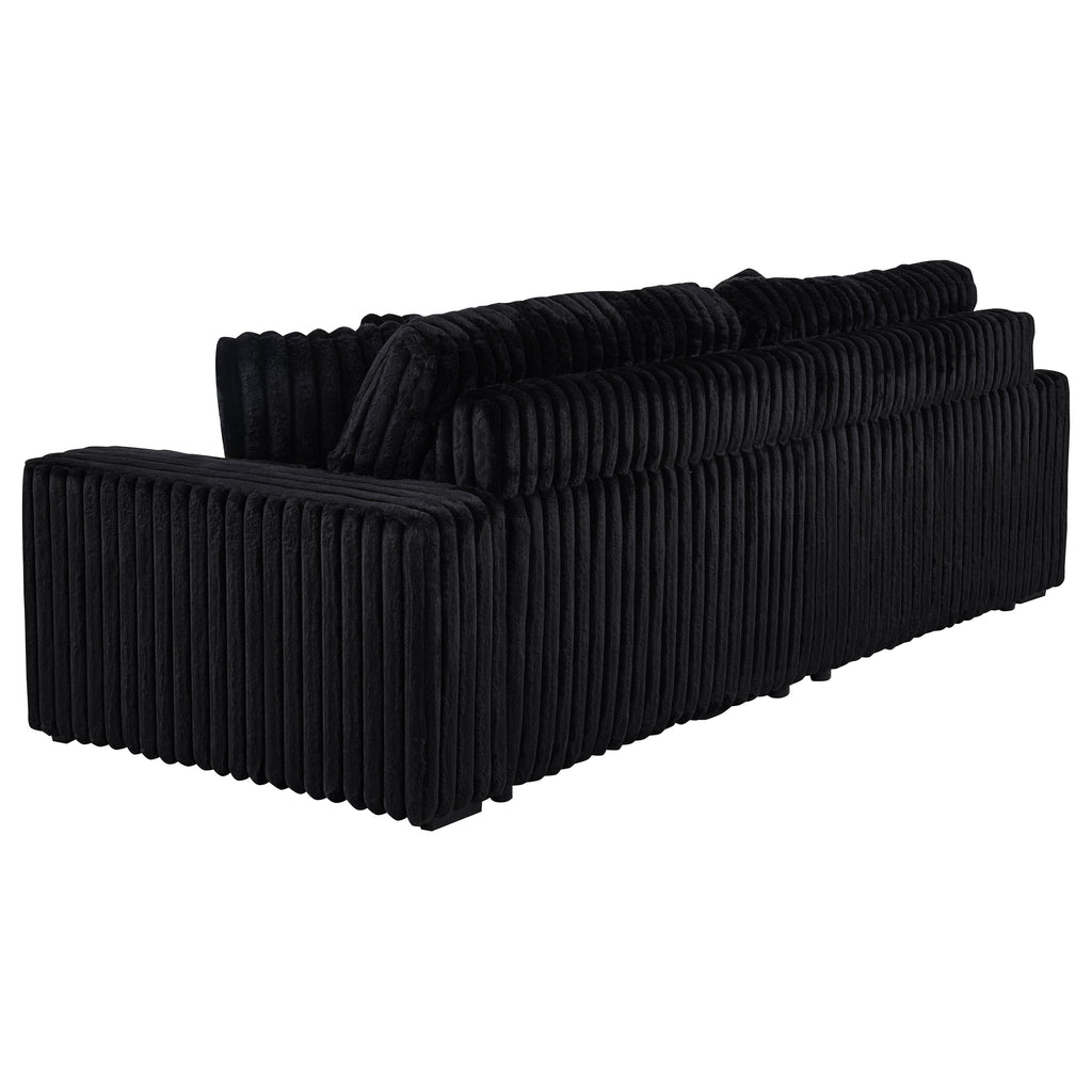 Contemporary sofa set in black corduroy features deep channel tufting and dual power chaise design