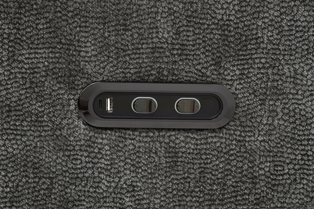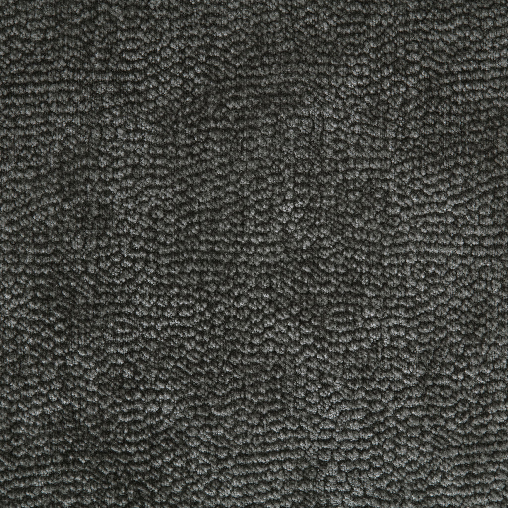 Dark grey chenille upholstery features a soft texture with a refined woven appearance