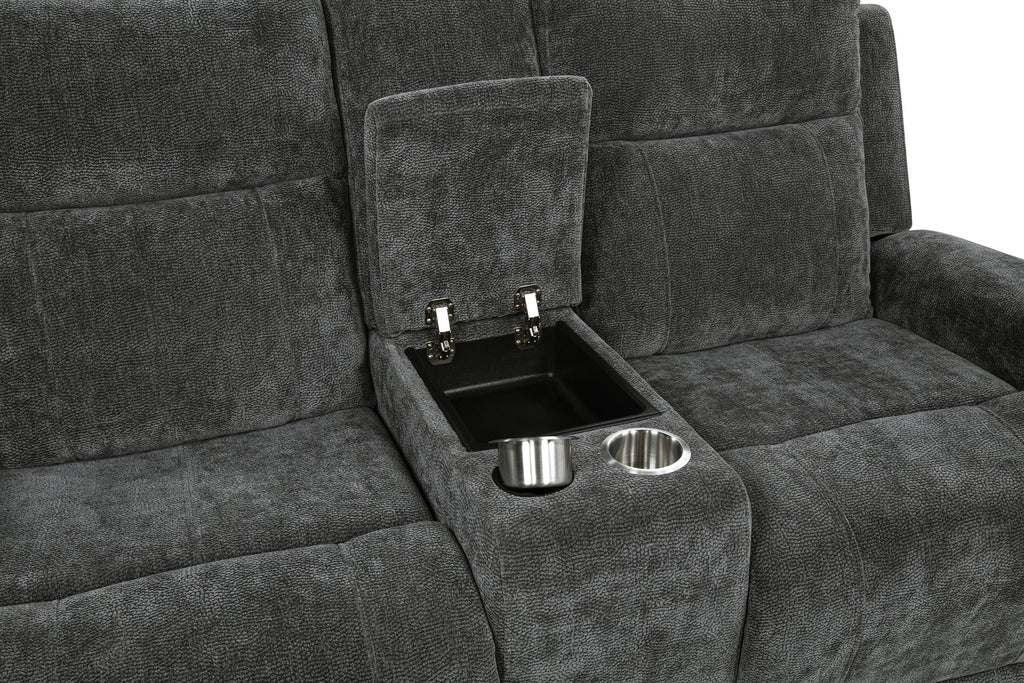 Wrap yourself in the comfort of this chenille power reclining sofa set, where modern design meets everyday luxury. Smooth push-button recliners offer effortless motion, while plush cushioning and padded headrests enhance relaxation. The loveseat includes a center console with lift-top storage and removable stainless steel cup holders. Soft chenille upholstery and a sturdy metal frame complete this inviting ensemble.
