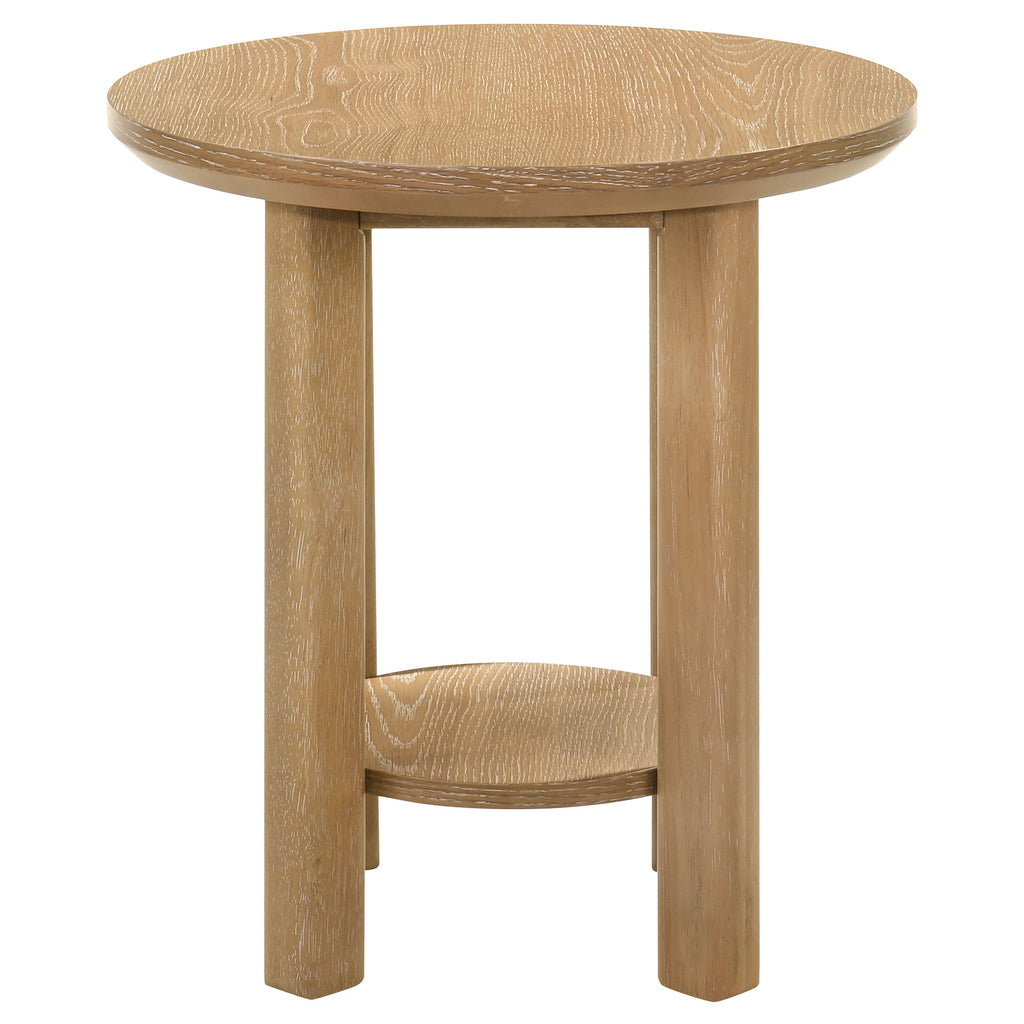 Light oak finish brings soft tone and subtle wood grain to the circular surface and shelf