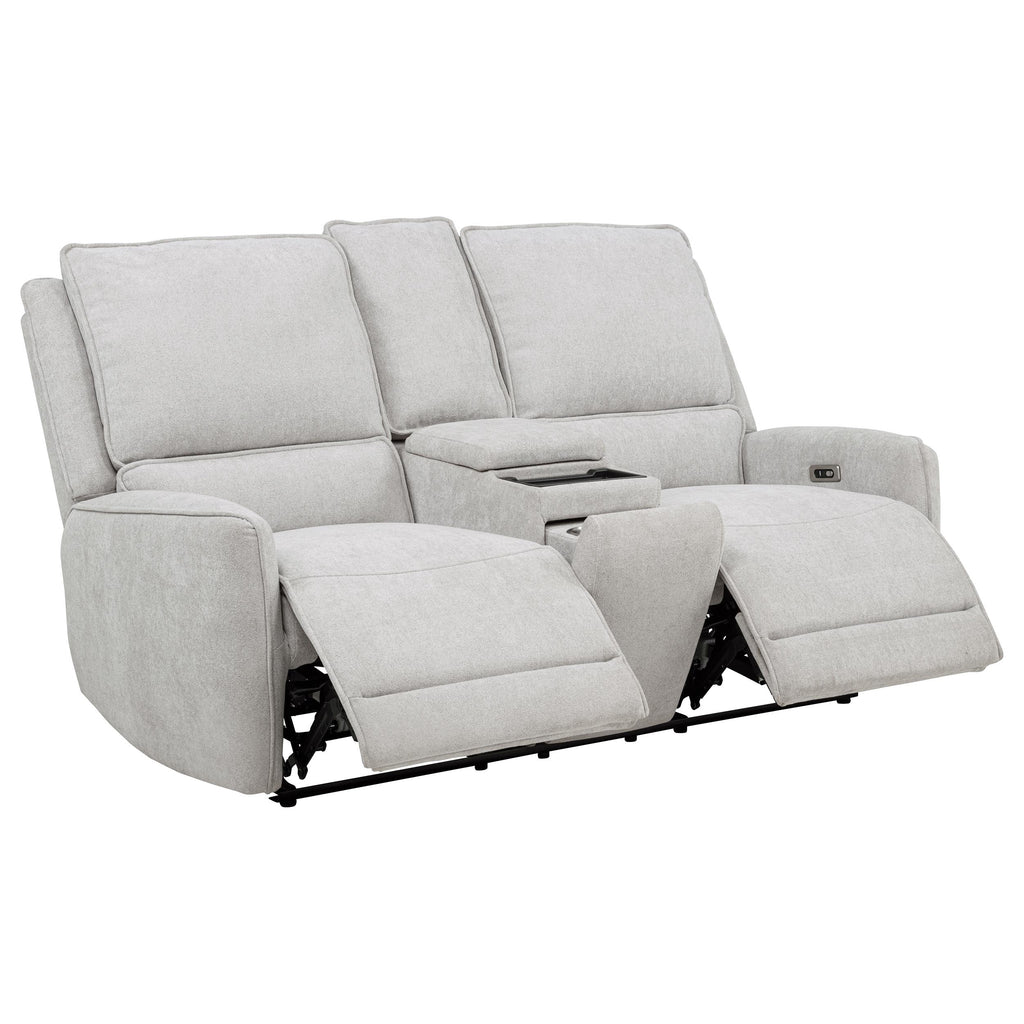 This reclining loveseat captures the essence of cozy sophistication, designed for shared moments and quiet indulgence. Outfitted in plush dove grey chenille, its smooth, sculpted form invites relaxation at the push of a button. Dual power recliners extend effortlessly, controlled by integrated side buttons, while a center console with hidden storage and cup holders adds functional ease. Built atop a sturdy wood and metal frame, it offers enduring comfort for two.