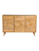 Make a statement with this three-door accent cabinet, blending mid-century modern aesthetics with natural charm. Crafted from solid mango wood, the checkered woodgrain pattern across the doors creates a striking visual texture. The spacious interior with two shelves provides ample hidden storage for a clutter-free space. Supported by tapered solid wood legs with gold-finished metal tips, this piece brings both elegance and functionality to entryways, dining rooms, or living areas. The warm natural finish complements a range of interior styles, making it a versatile addition to any home.