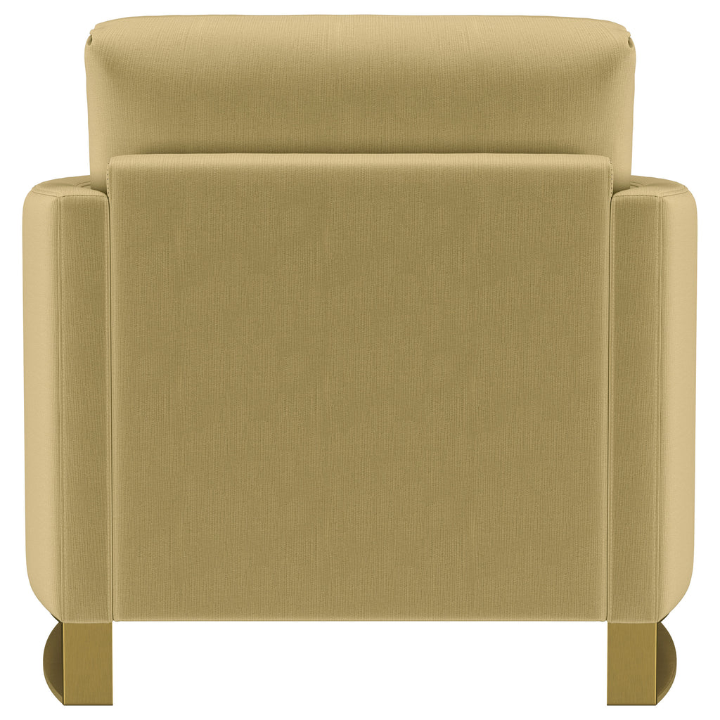 Indulge in opulent comfort with this textured velvet chair. Its reversible feather blend seat and back cushions, complemented by curved arms and gold stainless steel legs. Smooth upholstery and lustrous details blend simplicity with timeless splendor, making this piece a perfect focal point for refined interiors. With its inviting profile and graceful presence, it elevates both style and relaxation.