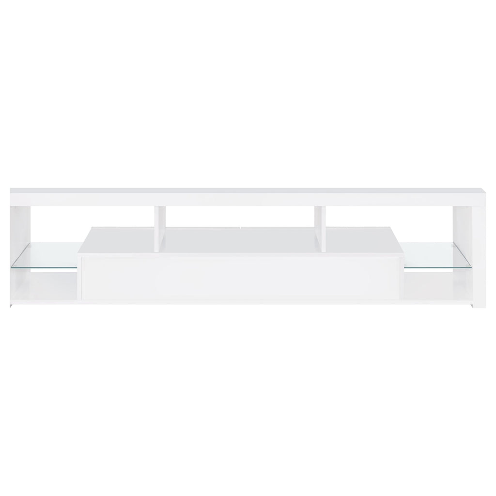 Sleek, modern TV stand with pristine glossy white finish and clear glass accents