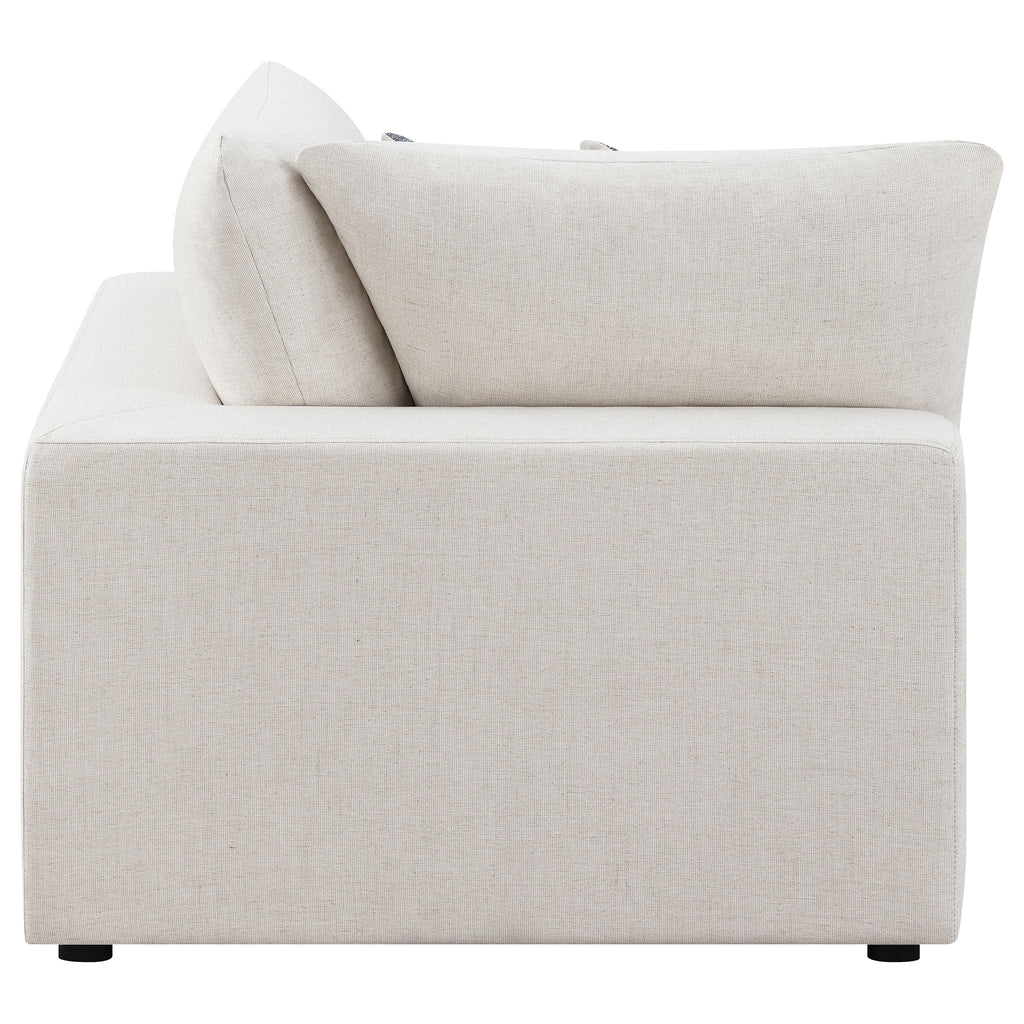 Includes: One (1) corner chairThe roomy sectional corner creates comfortable backless seating. Or use it to rest your legs, or... Includes: One (1) corner chairThe roomy sectional corner creates comfortable backless seating. Or use it to rest your legs, or place items such as trays or magazines in easy reach. Linen provides beauty and textural interest. The natural color lends itself to any relaxed decor. It's a perfect end to a perfect sofa. - Fabric Color: Beige - Leg Color: Black - Upholstery: Linen-Blend - Fabric Content: Polyester 80%, Linen 20% - Clean Code: Ws - Overall Weight Limit: 300 Lbs - Assembly Required: Yes - Materials: Fabric, Foam, Larch, Plastic, PlywoodModular construction allows you to easily build the perfect seating area for your spaceSeating is full foam wrapped in feather down while back cushions are feather down blend for the best seating experienceSeating is full foam wrapped in feather down while back cushions are feather down blend for the best seating experienceAccent pillows in a soft jacquard are includedAll cushions are removable making it easy to clean and maintainAvailable in both beige and charcoalDimensions:Corner :41.00"w x 41.00"d x 33.00"h View more