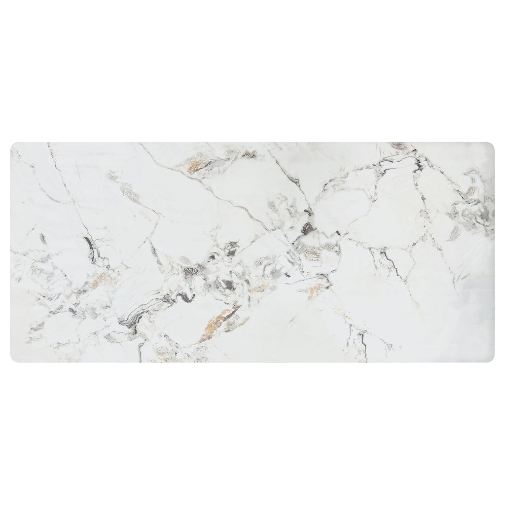 Rectangular table top is made from durable sintered stone in a multi-tonal white mirage finish