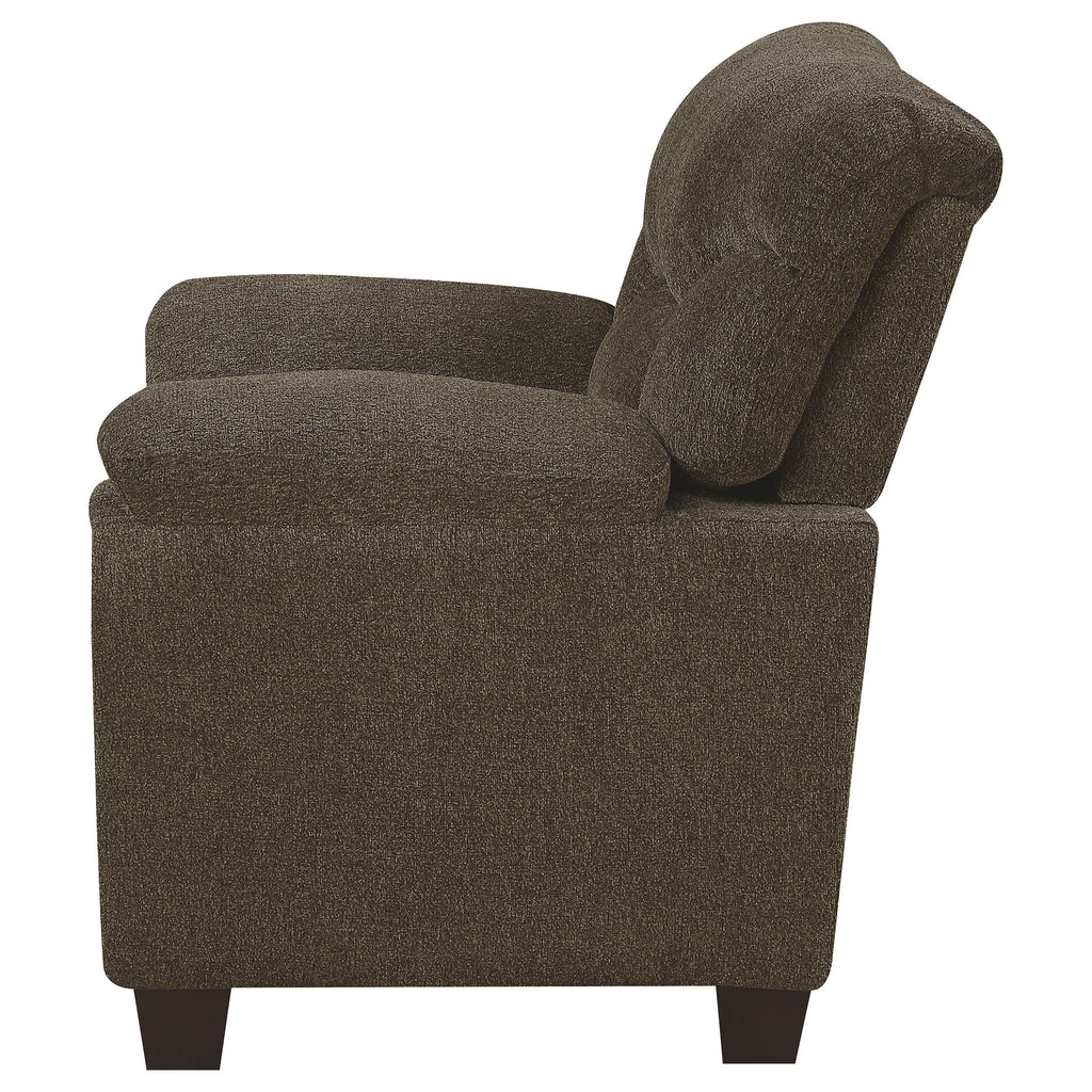 This elegant armchair creates a cozy and inviting aesthetic in any living space. Its fabric upholstery is exquisitely soft and is offered in a variety of attractive colors. With a comfortably padded seat and an ultra-plush headrest and arms, it's the perfect place to rest and relax after a long day. A cool, stitched design and trendy nailhead trim add a pleasing touch of style to its classic design. Sturdy, tapered legs complete its attractive look while adding plenty of stable support.