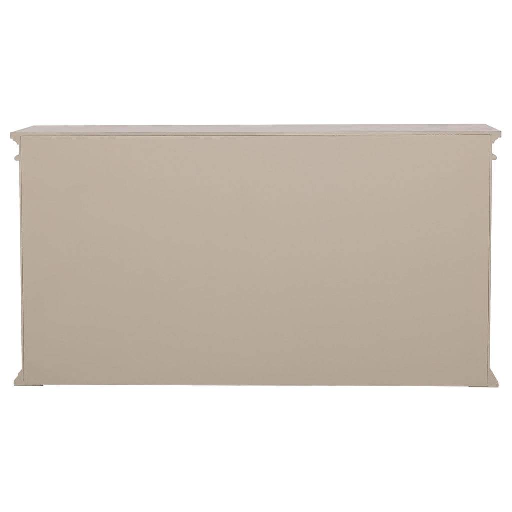Traditional with country flair, this accent cabinet makes a fine furniture piece for a modern farmhouse style home. A light honey finish with a subtle weathered look adds a rustic charm, while glass panel cabinet doors feature a classical trim design. A double set of cabinet doors invite you to organize books and server sets, making is suitable for a living room or dining room space. Fastened on each of the four doors is an antique-style hardware pull with a contrasting dark bronze finish that lends a classic touch. A flush base offers extra stability and support while a spacious narrow tabletop offers room for table lamps and decor.