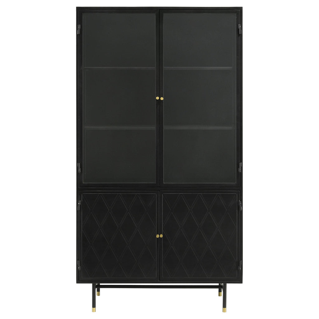 This industrial style metal cabinet offers ample storage space and a bold look in a space. With its matte black finish and accents of antique brass finish hardware, the cabinet offers a subtle contrast while exhibiting style and grace. With its tall design and rectangular shape, this cabinet takes up minimal floor space, bringing the eye up to showcase decor and collections behind tempered glass doors. Adjustable shelves and interior shelves behind the bottom cabinet keep everything from barware to throws and linens. Resting on a trestle base with legs capped in a matching antique brass finish hardware, this elegant and stately accent cabinet offers a touch of glam too.