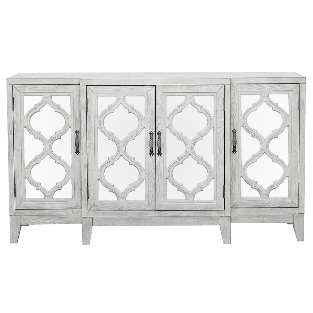 This traditional accent cabinet adds an elegant feel to your home. It's crafted in a gorgeous white finish and features tapered legs. The rectangular top is spacious enough for lamps, vases, and other decorative knickknacks. The four cabinet doors are designed with beautifully crafted lattice wooden overlay with vintage style decorative door handles in a vintage bronze finish. Doors also are inlaid with mirrored panels and open up to convenient storage shelves.