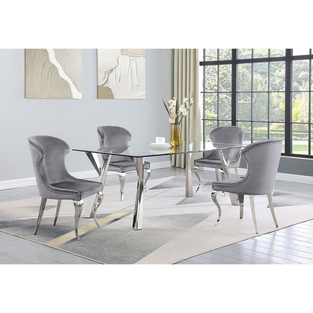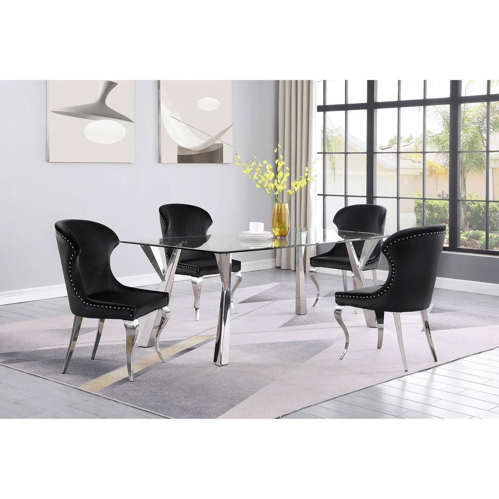 Sculptural style instantly elevates the modern glam aesthetics of a contemporary dining table. The rectangular table is topped with beautiful clear glass, complete with an elegant beveled edge for a polished look and feel in your dining room. Flared, geometric legs add sophistication and artistry, certain to capture attention for everyday dining or elegant entertaining of friends and family. A polished chrome finish brightens the look of the table and offers a neutral complement that glistens in the light. Clean and precise in style, this modern dining table is a gorgeous choice for your sophisticated space.