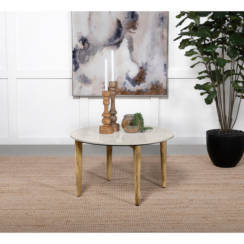 A low-key yet elegant look starts with a hand-crafted round coffee table with earthy tones and plenty of versatility. Choose this coffee table to round out a space with a natural design aesthetic and add a fluid look to a living room or family room. Made in India, this cocktail table is assembled with organic materials including a round white and gray marble top. Its shapely mango wood base features tall, tapered legs. As a handcrafted piece, this table’s marble top will vary in patterning.