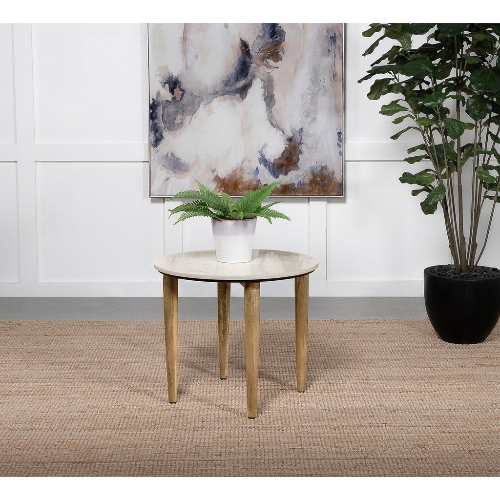 Easy, natural style offers a fresh look to a casual living space as this end table adds low-key yet elegant personality. A rustic feel and warm motif follow this round table crafted in India. Organic materials deliver an earthy aspect to easy-living furniture, with a round white and gray marble top. Tall, round tapered legs made of natural finish mango blend beautifully, both with the marble top and surrounding décor. Expect an individual and unique marble pattern on each tabletop.