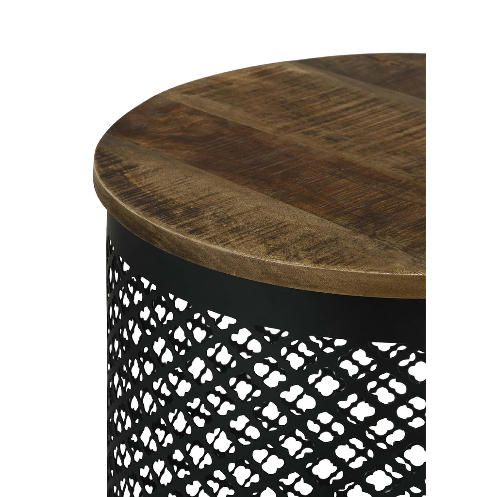 Rustic elements collide with classical designs in this industrial style accent table. Featuring a drum shape base wrapped in a perforated metal latticework grid with quatrefoil motif, this accent table offers up traditional patterns with modern materials, creating a contrasting black finish. Topped with an eco-friendly mango wood top, this accent table makes a charming addition to sustainable homes. The deep natural finish of the top accentuates the woodgrain and offers a warmth to the space. Place this accent table beside a chair for a place to keep refreshments or allow it to double as a nightstand in a compact bedroom.