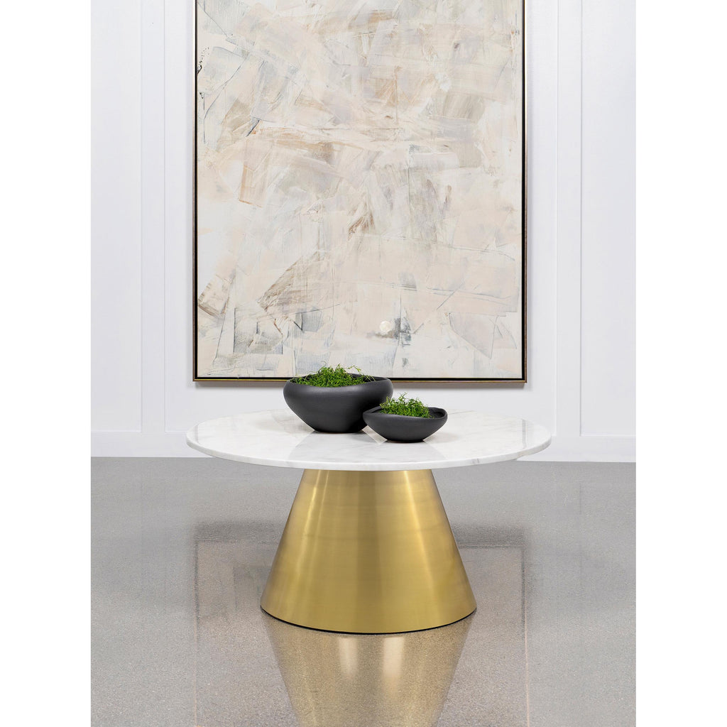 This modern coffee table exudes luxury with its gorgeous white marble top and conical metal base. The round profile creates a unifying, sophisticated focal point in any living room. Crafted from genuine marble, the tabletop radiates elegance, while the brushed gold finish on the metal base adds warmth and refinement. This beautiful table is the perfect centerpiece for both daily enjoyment and entertaining, bringing style and function to your space. Add a vase of fresh flowers for a designer touch.