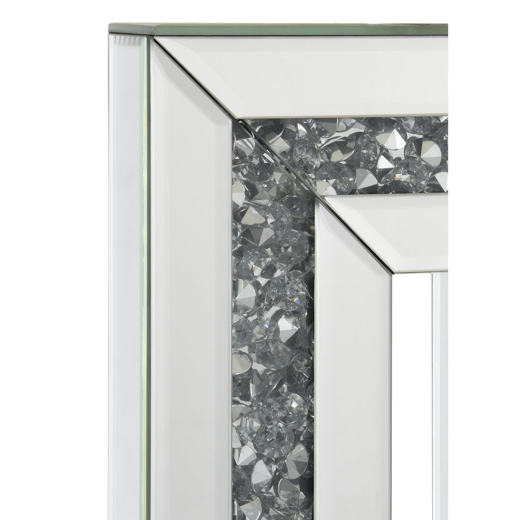 Glimmering dark crystal-like accents emerge from the base interior of this stunning contemporary table lamp. A narrow base outlined in mirror tile accents the edges, creating a beveled look. Mirror tiles also line the flush base, further lending to the reflective, polished nature of the lighting piece. Surrounding the bulb is a square shade wrapped in a white fabric to create a soothing, diffused glow. A transparent acrylic finial tops it all off for one last luxe touch.