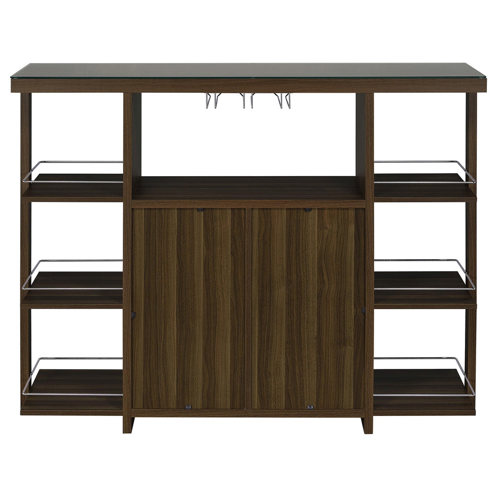 Complete a modern minimalist motif with the sleek lines from this walnut bar unit. Display your favorite glass stemware on the wine glass holders or on the six side shelves. In a warm hue, the open silhouette looks elegant with a shiny metallic guardrail that helps to secure belongings. A built-in eighteen bottle wine rack is great for the social entertainer. Enjoy a freshly poured libation around the bar, perfect for a transitional space or versatile living room.
