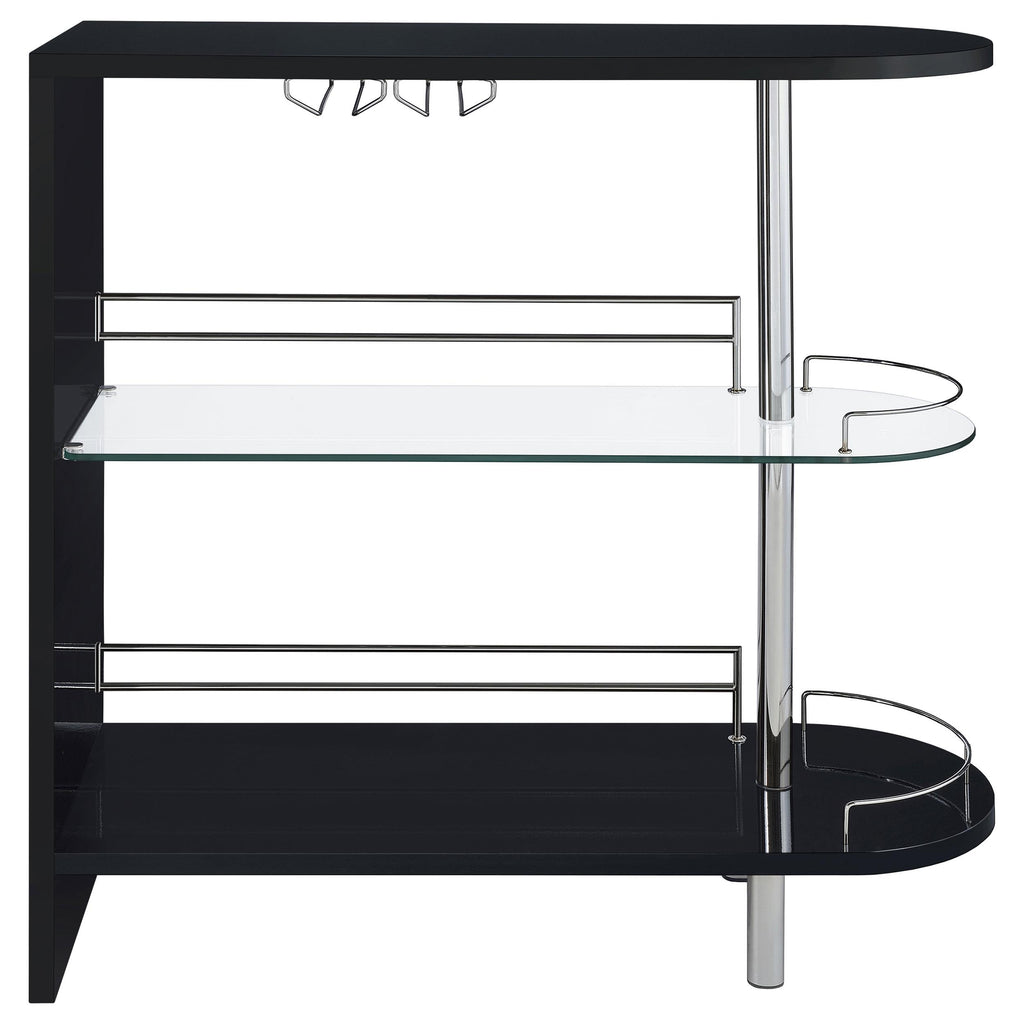 This stylish bar unit is a fabulous option for your entertaining needs. A sleek silhouette and glossy black finish give it a chic, modern appeal. Its tempered glass storage shelves offer a handy place to display a collection of fine wines and spirits. Protective guardrails help prevent accidental spills and keep bottles safe and secure. A handy stemware rack rounds out the versatile convenience of this contemporary bar unit.