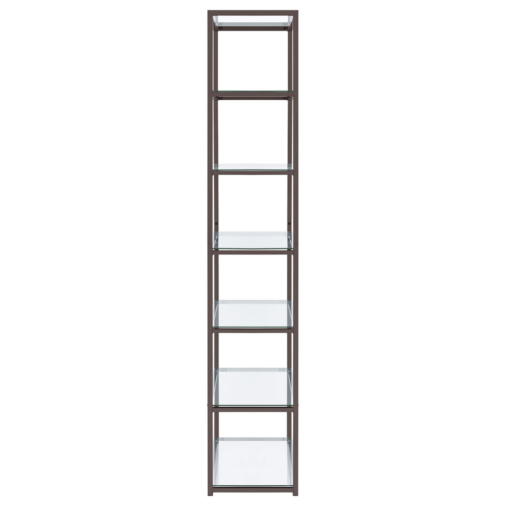 Sleek, elegant, and stylish. This bookcase brings a tasteful look to a contemporary living room or family space. Built from steel with a black nickel finish, its frame is delightfully neutral, yet beautiful. Clear tempered glass shelving offers a gorgeous coordinating look. Display decor, books, and miscellaneous on six tiers of shelving.