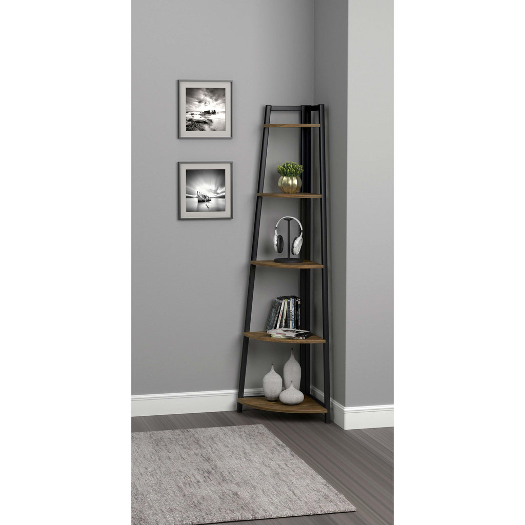 With a compact design that's ideal for smaller rooms, this transitional bookcase is a stylish space saving solution. Crafted to tuck neatly into a corner, it's perfect for showcasing decorative pieces without taking up too much space. The durable, black metal frame adds sturdy support and stability. Five shelves of varying sizes create an attractive display space. Pair this beautiful bookcase with a matching storage unit to easily create a put-together living space.