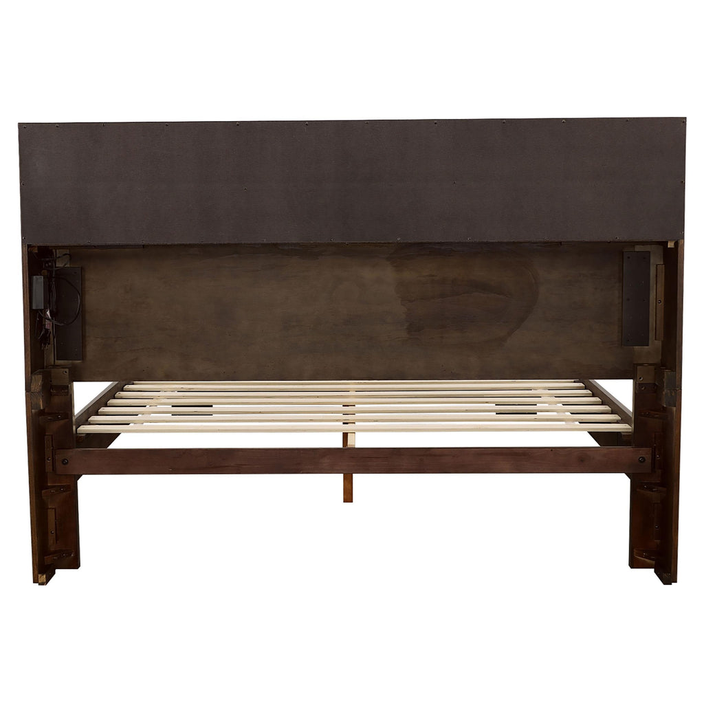 From the Jessica collection, this California king bed cuts a stately pose that transforms any master bedroom. Storage headboard has three spacious open cubby squares for alarm clocks and even a small lamp or two. The low-slung footboard gives the bed an overall more modern touch. Its cappuccino finish is rich and inviting. To complete the bedroom set, consider the optional matching side table or chest (or both!) from the same collection.