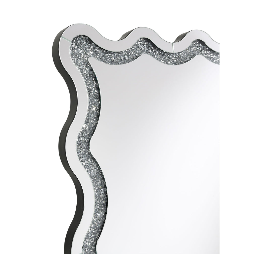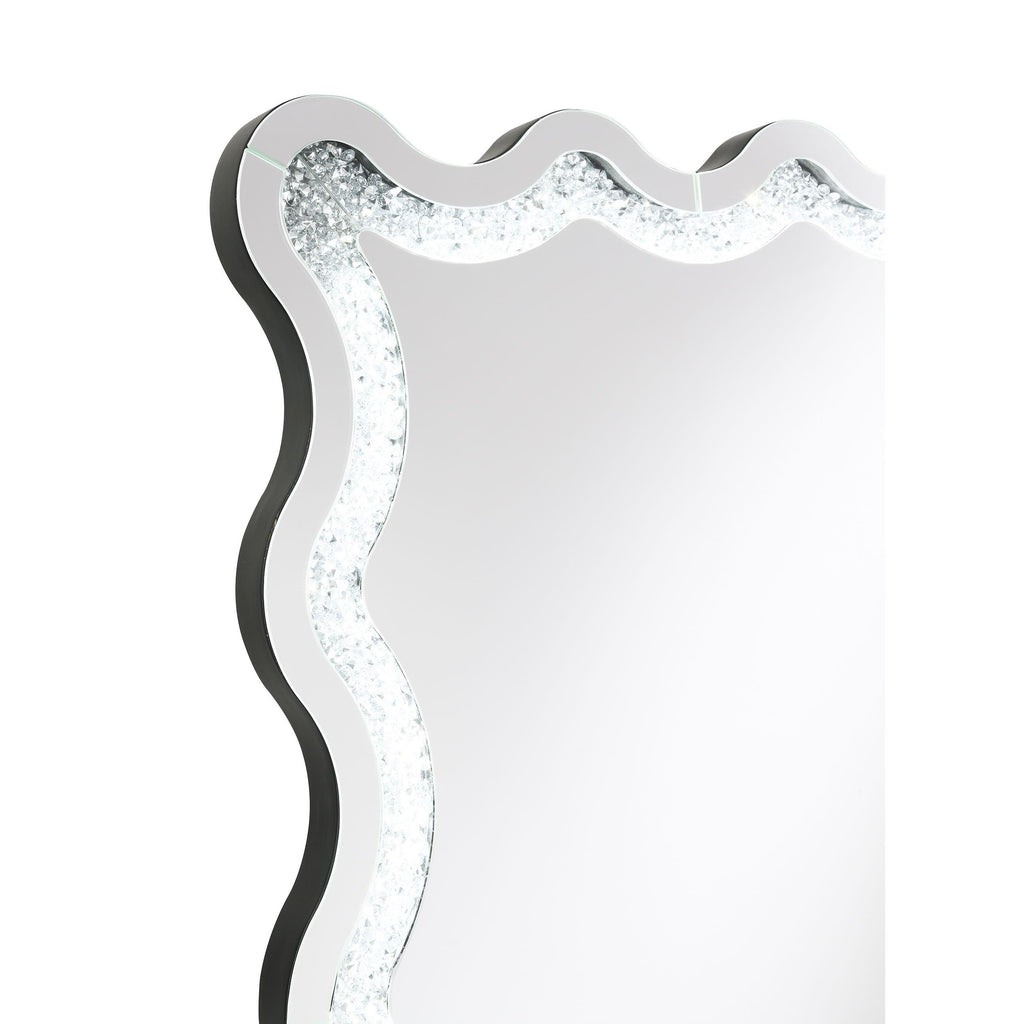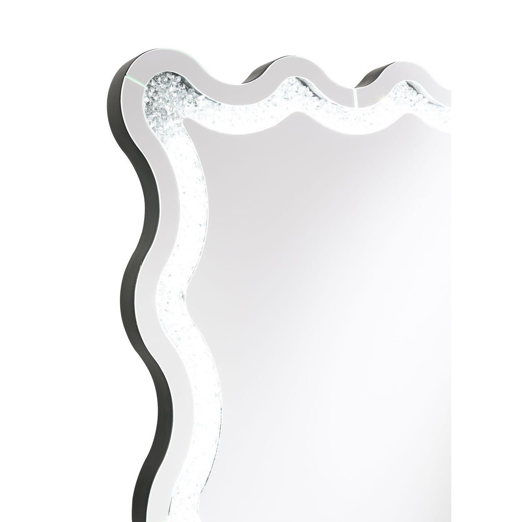 Introduce modern glam sophistication to your bedroom or living area with a contemporary LED floor mirror. It includes a frame that allows it to stand on its own, creating the option for placement anywhere in your space. The mirror boasts a dynamic frame design, with a wavy silhouette created with convex and concave curves that introduce a flowing, engaging ambiance. Mirror and diamond-like trim layers create sparkle and sophistication, perfect for a modern glam bedroom setting. The mirror includes an LED light, perfect for illuminating your daily wardrobe choices in a master suite.