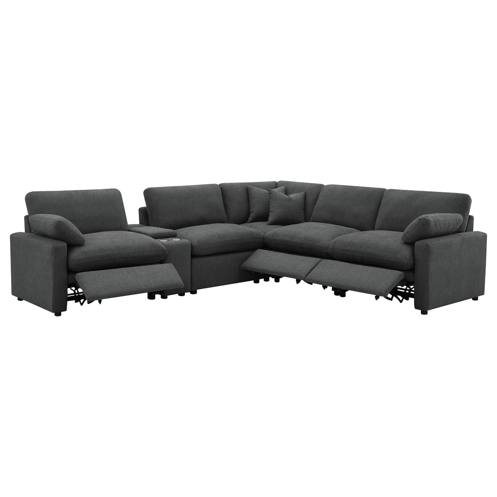 Transform your living space with the versatile 5-piece modular sectional, designed to offer a perfect blend of comfort, style, and customization. This sectional features three power reclining pieces and two non-reclining pieces, allowing you to create your ideal seating environment. With the option to add additional power or non-power armless chairs, you can customize the layout to suit your room and preferences. Enjoy the plush comfort of premium down-like filled cushions and a sleek, modern design that enhances any decor. Experience the ultimate in relaxation with the power reclining pieces, featuring a 4-inch wall-hugging design for full recline without needing excessive space.