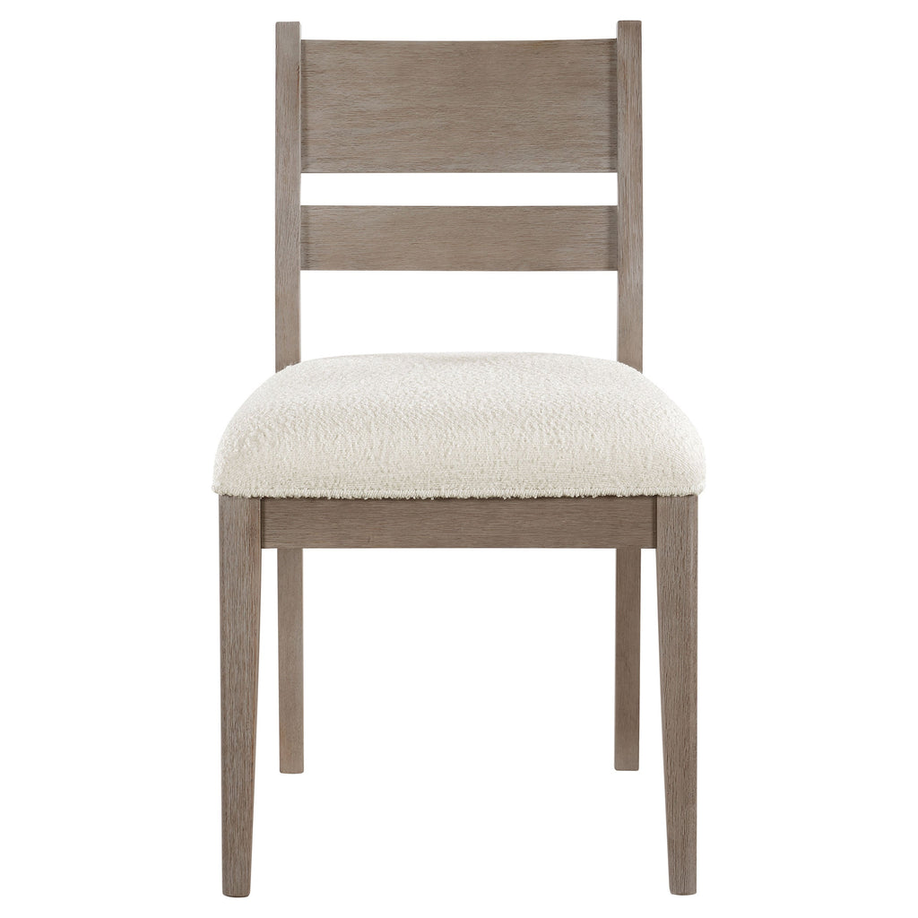 Upgrade your dining table with a set of two modern farmhouse side chairs. Perfect for a casual kitchen table, they feature coastal character with a grey wood finish that offers subtle wood grain patterning. Upholstery is a creamy white with wonderful texture that adds depth and comfort. The inviting chair design includes a gently angled back with a modified ladder back that pairs a wide top slat with a slimmer lower slat to create a compelling asymmetric silhouette. This pair is great for kitchens and dining rooms, alike.