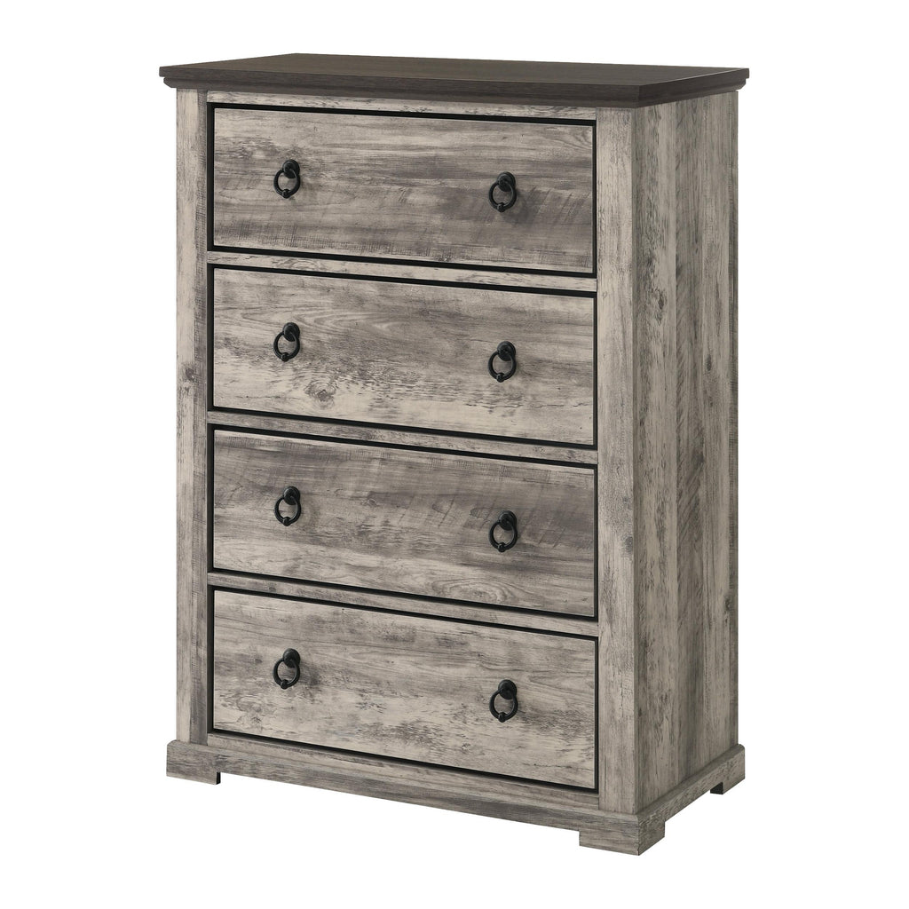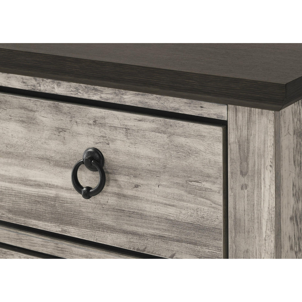 The Ella Mae Chest from Crown Mark will surely make a statement in your bedroom. It features five drawers with ring pulls, and comes in a distressed beige finish with a brown top.