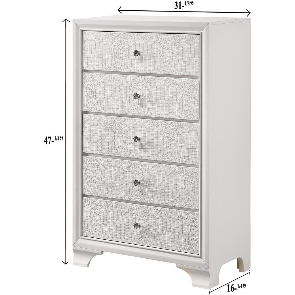 The Lyssa Dresser from Crown Mark will make a beautiful addition to your bedroom. It features five drawers with chrome finished hardware, curved-in feet and comes in a Frost finish.