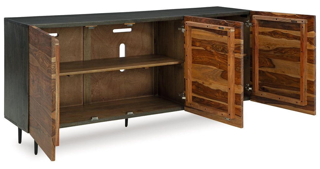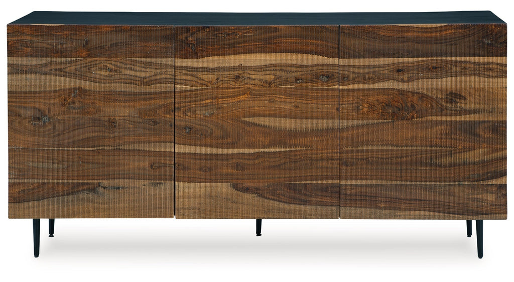 This mid-century modern inspired piece is skillfully crafted with durable solid mango and shesham wood. The natural and deep brown finish in addition to the fluted, grooved door fronts provide character anywhere it’s displayed. Pair it with sumptuous velvet upholstery and accents in a brushed brass-tone finish for an exquisite look.