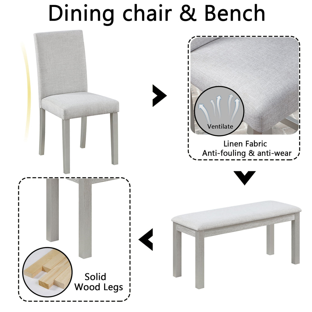 6 Piece Wooden Dining Table Set, Wooden Dining Table With 4 Upholstered Chairs And Bench For 6 People, Rectangular Dining Table Set With Crystal Decoration For Kitchen, Dining Room - Silver Gray