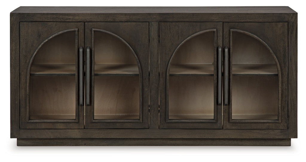 Bring a timeless look to your home or office with this accent cabinet. Traditional lines and a distinctive two-tone finish lend seriously classic vibes to this piece. Arched glass door fronts and two shelves make it easy to display and store in stunning style.