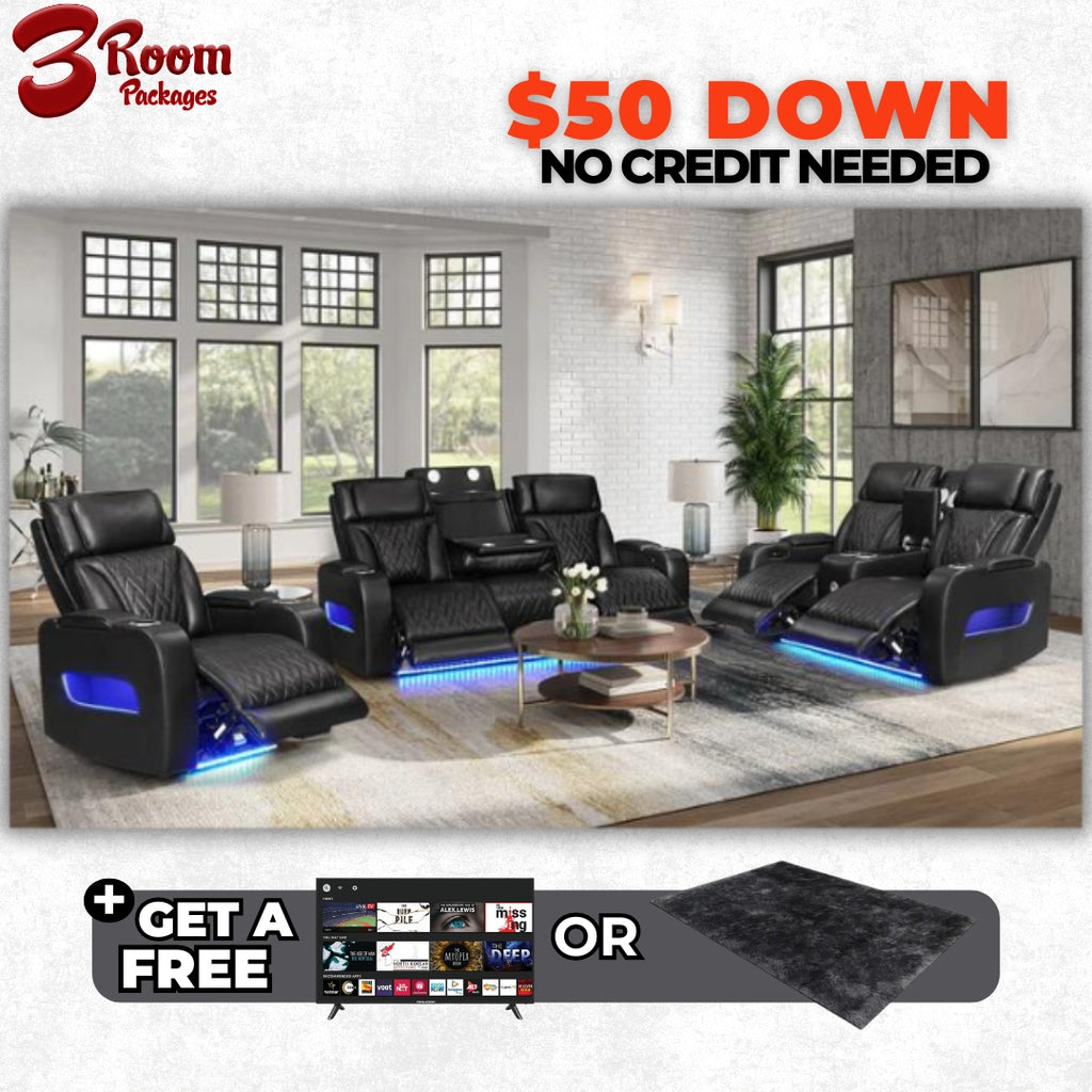 Experience the ultimate in comfort and luxury with the DUBAI 3PC Black Power Reclining Set – now with your choice of a FREE area rug or TV! 😍