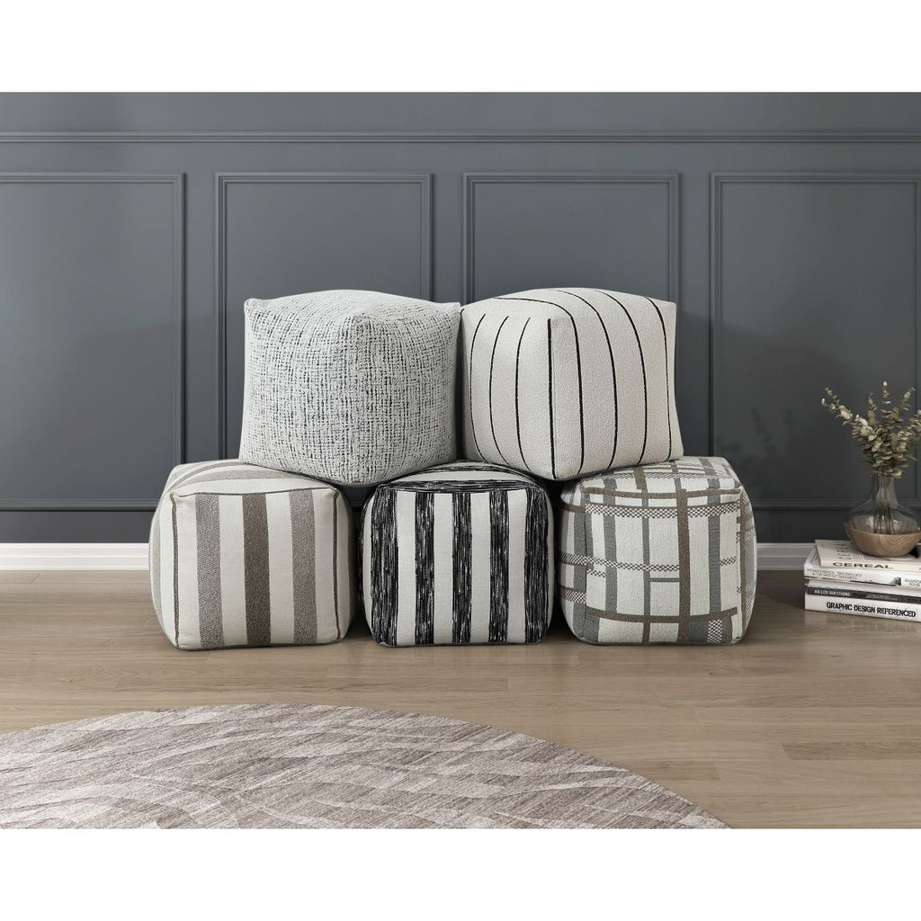 Whether the Easley Collection serves to provide stylish accent to your homes dcor, convenient seating when the need arises, or as perfect place to put up your feet, the square accent poufs versatility of purpose makes it a convenient addition to your space. The pouf is covered in gradiated black and white chenille fabric upholstery.