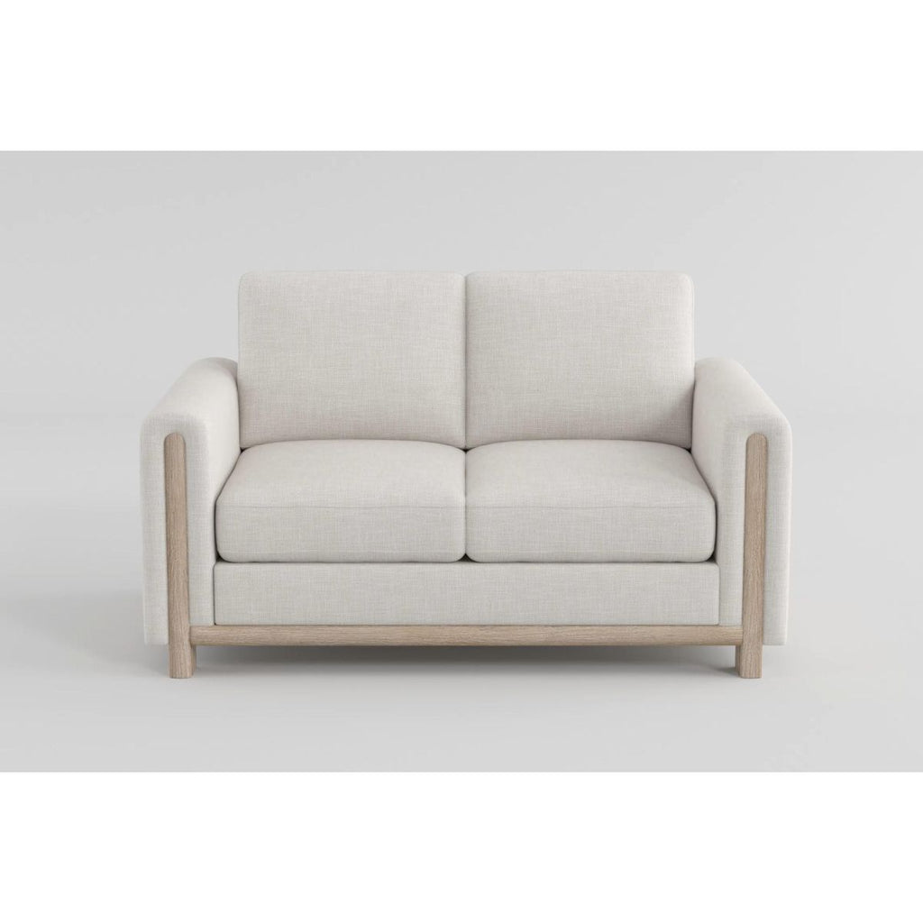 This contemporary loveseat, featuring a clean design with exposed solid wood framing and comfortable textured fabric, is the perfect addition to smaller living rooms, apartments, or cozy spaces, offering both sophisticated style and intimate seating. Built with a robust solid wood and plywood frame, high-density foam padding over pocket coils, and elegant natural-finished solid wood legs, this loveseat ensures lasting durability and a plush seating experience. With convenient features like reversible back cushions and removable zippered covers, it's not just a beautiful piece but also a practical one, designed for easy maintenance and a consistently fresh look.