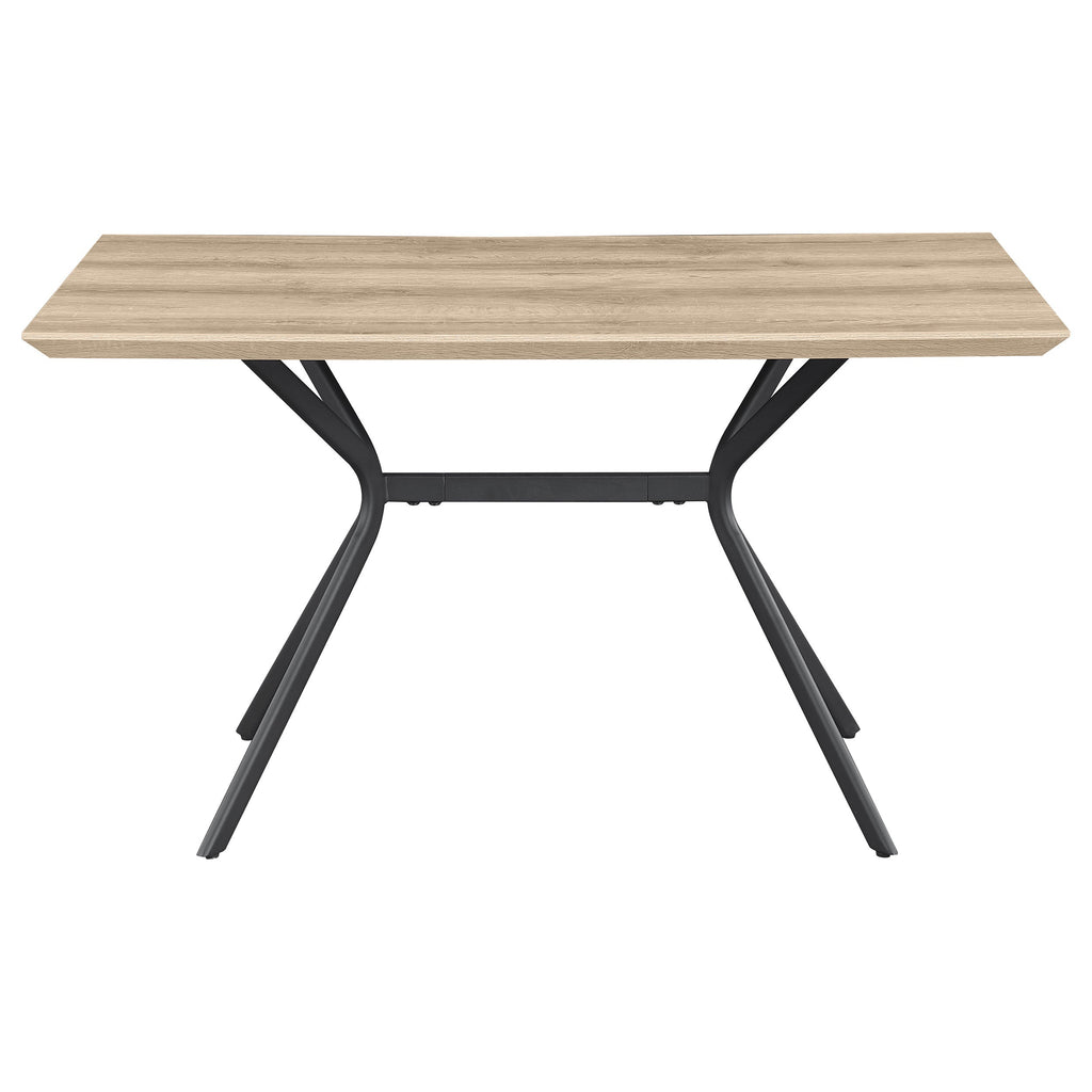 Freshen up your kitchen or dining room with a modern casual dining table. Its rectangular silhouette is versatile and stylish, perfect for multi-functional spaces like breakfast nooks and compact dining rooms. It boasts a medium brown wood grain tabletop finish, crafted with melamine for excellent durability and resistance to denting and scratches. An angled edge adds polished flair, perfect for an approachable, contemporary space. The table's base features four angular V-shaped legs with a crossbar support, all in a black finish over metal construction that provides stability.